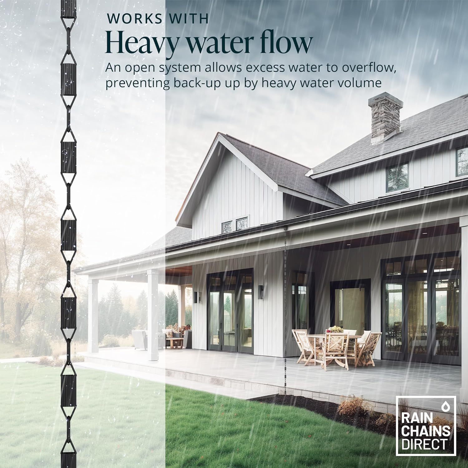 Unrestricted Water Flow – The open-flow design of the gutter chain downspout allows water to effortlessly cascade down the chain without fear of backing up, even in heavy rain.