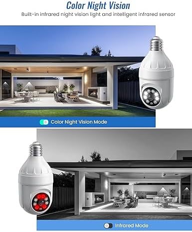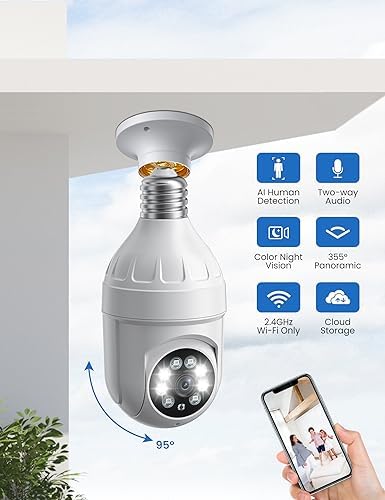 1080p Wireless Bulb Security Camera, 355° Panoramic Dome Cam, Live View, Indoor/Outdoor Surveillance, AI Human Detection, 2-Way Audio, Color Night Vision, Cloud Storage, Spotlights