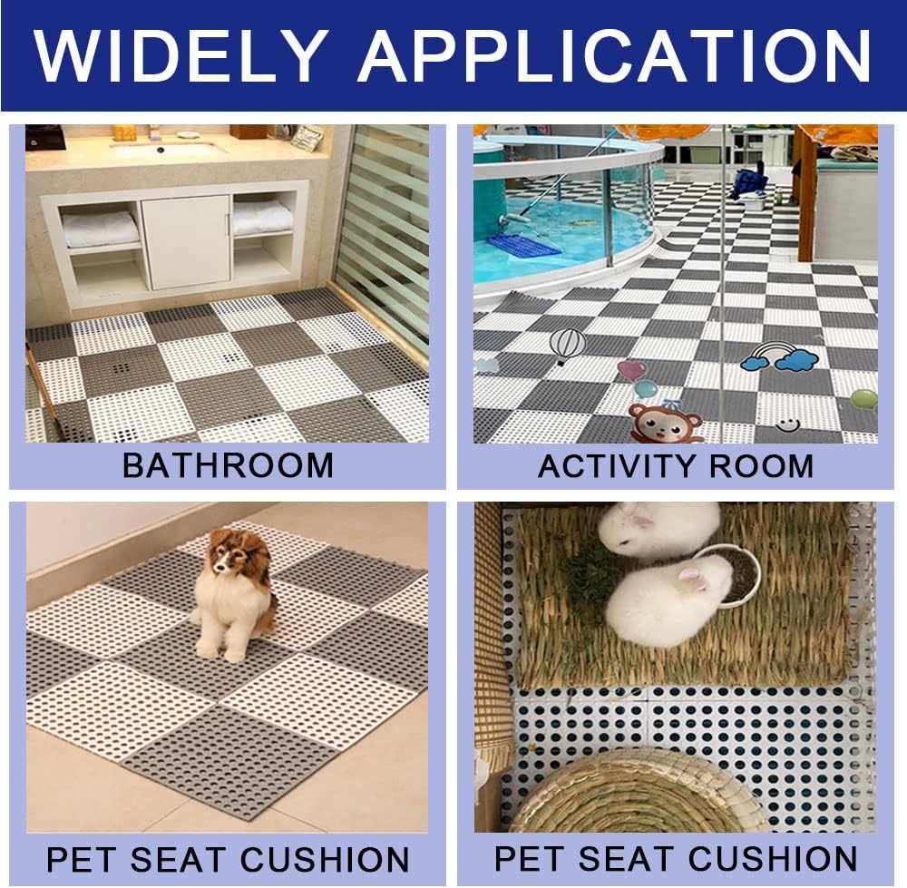 【Size】We provide 12 pieces of Non slip plastic drainage tiles, includes 6 grey and 6 white in total. Mats are 12 x 12 inch / 30 x 30 cm, 0.3 inch in thickness, easy to trim to your desired size so that custom shaped areas and re-configurable.