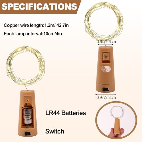 Package: Come with 12PCS cork lights, the 10 LED lights are bright enough for decoration, ideal for indoor & outdoor using. Per item length: 1m/3.4feet, total LED chips:10 LEDs/per lights. Distance between per LED chips: 10cm/4 inch.