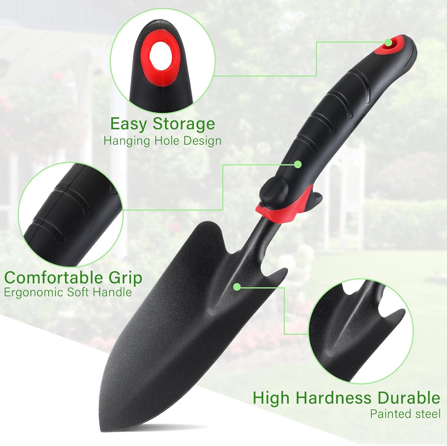 User Friendly Designed Handles: say goodbye to hand fatigue with our scientifically designed handles of these gardening hand tools; They are concave and convex to fit both small and large hands comfortably; The handles are made from quality rubber material, which reduces wrist and hand strain; The practical hanging hole on each handle makes for easy storage
