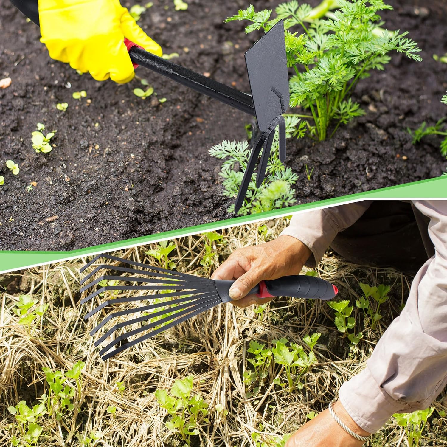 Extensive Variety of Garden Tools: experience the convenience of having a variety of gardening tools and supplies you need in this set; We offer you 6 types of tools in twos: a narrow trowel, a wide trowel, a hand fork, a weeding hand rake, a dual purpose hoe, and a manual weeding knife; Such a set lets you engage in different garden tasks, from digging and loosening soil to aerating and transplanting