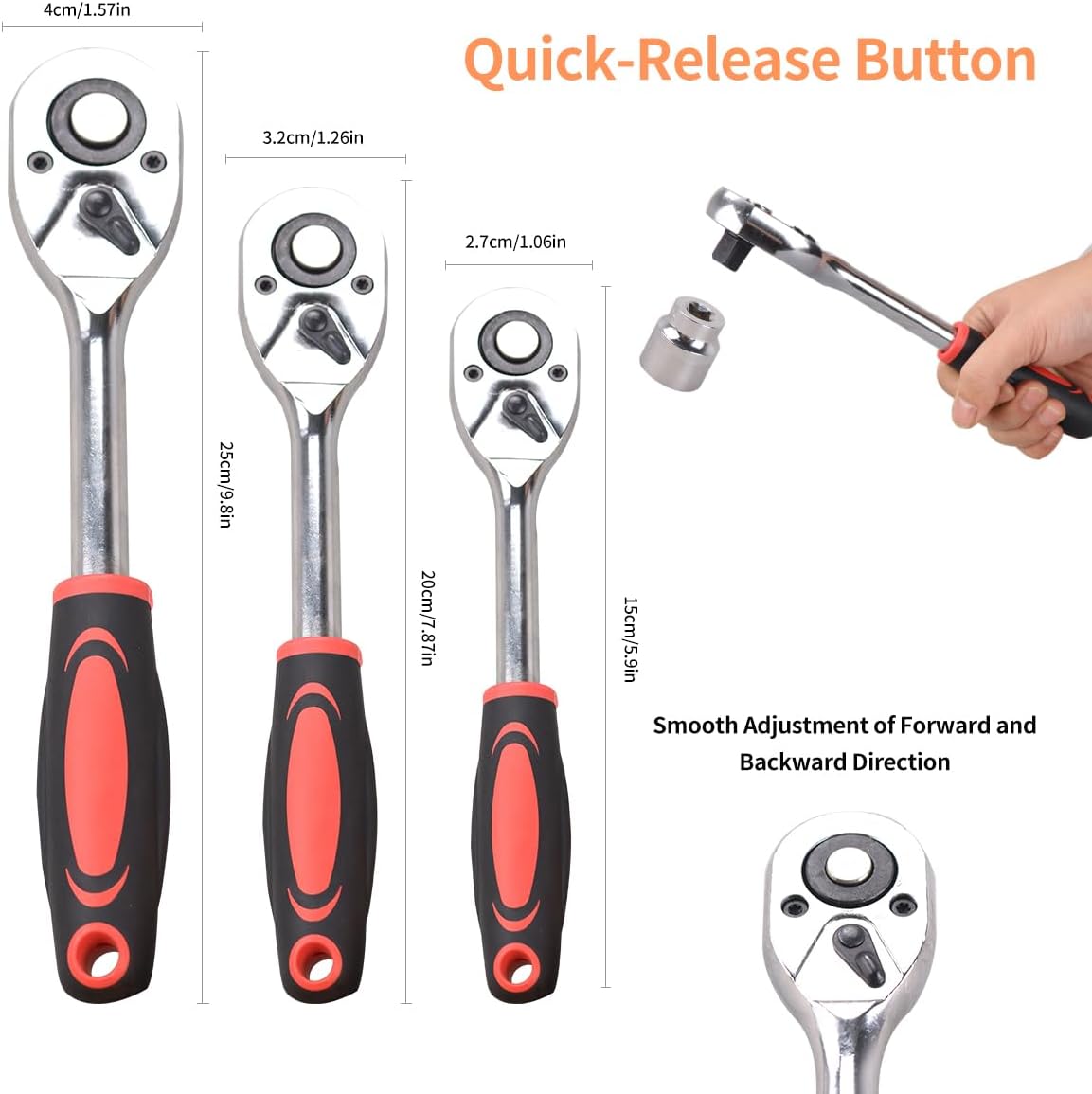 The Socket Set includes 72-tooth ratchet wrench in 1/4 inch, 3/8 inch and 1/2 inch with quick-release button