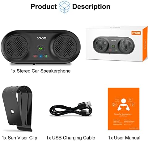 1x Stereo Car Speakerphone1x USB Charging Cable1x Sun Visor Clip1x User Manual Operation Frequency: 2.402-2.48GHz Operation Range: Class 2, 10 meters Battery: 1150MAH Rechargeable Lithium Battery