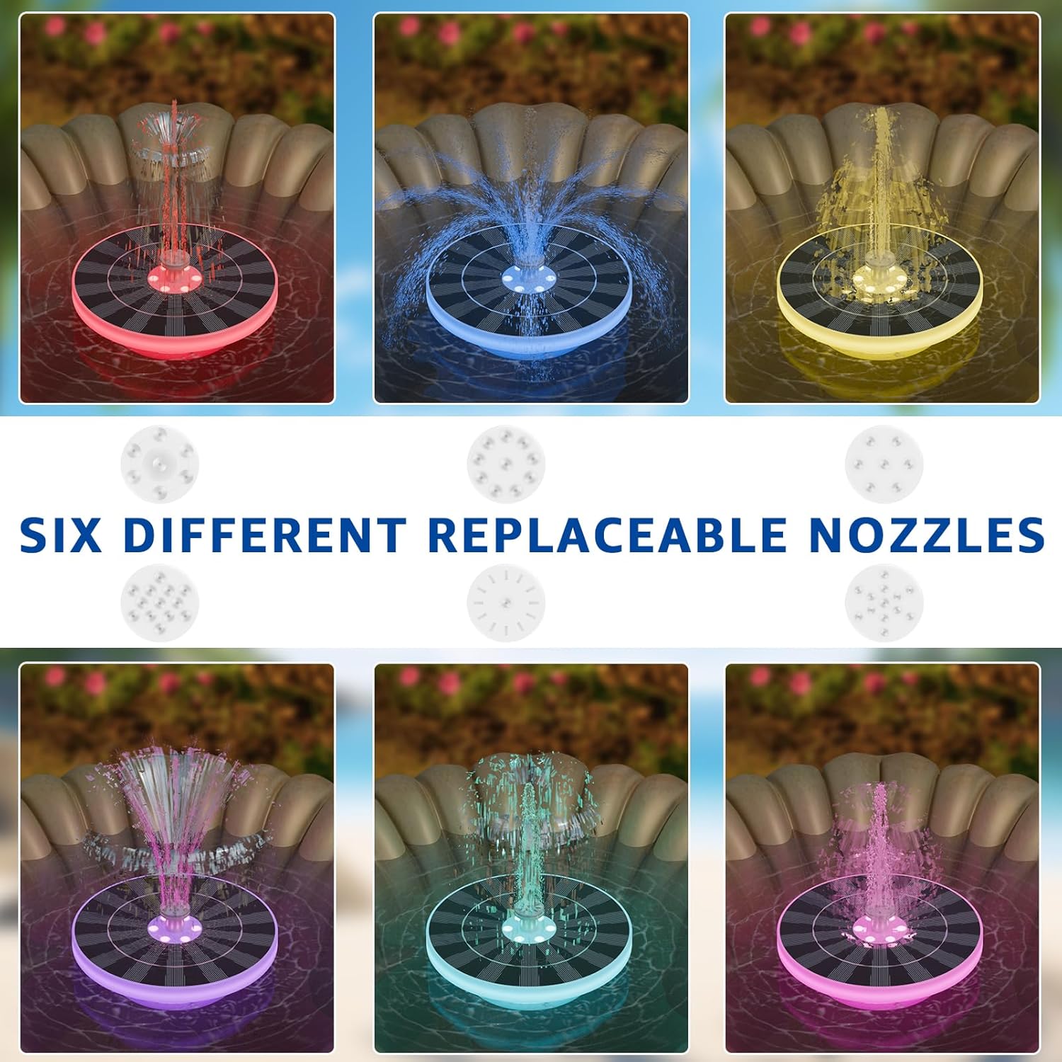 ⛲【6 Different Spray Heads】 Solar water pump with 6 different water spray modes which will produce different spray shapes and spray patterns. The water output pattern and height can be adjusted by changing different nozzles. The 4 plastic pipes can effectively prevent the fountain from dangling side to side, and spilling out the bird bath, keeping the outdoor fountain working and stable It receives the brighter the sun, the better the effect. You can choose different water fountain patterns easily, adding much fun into your garden.