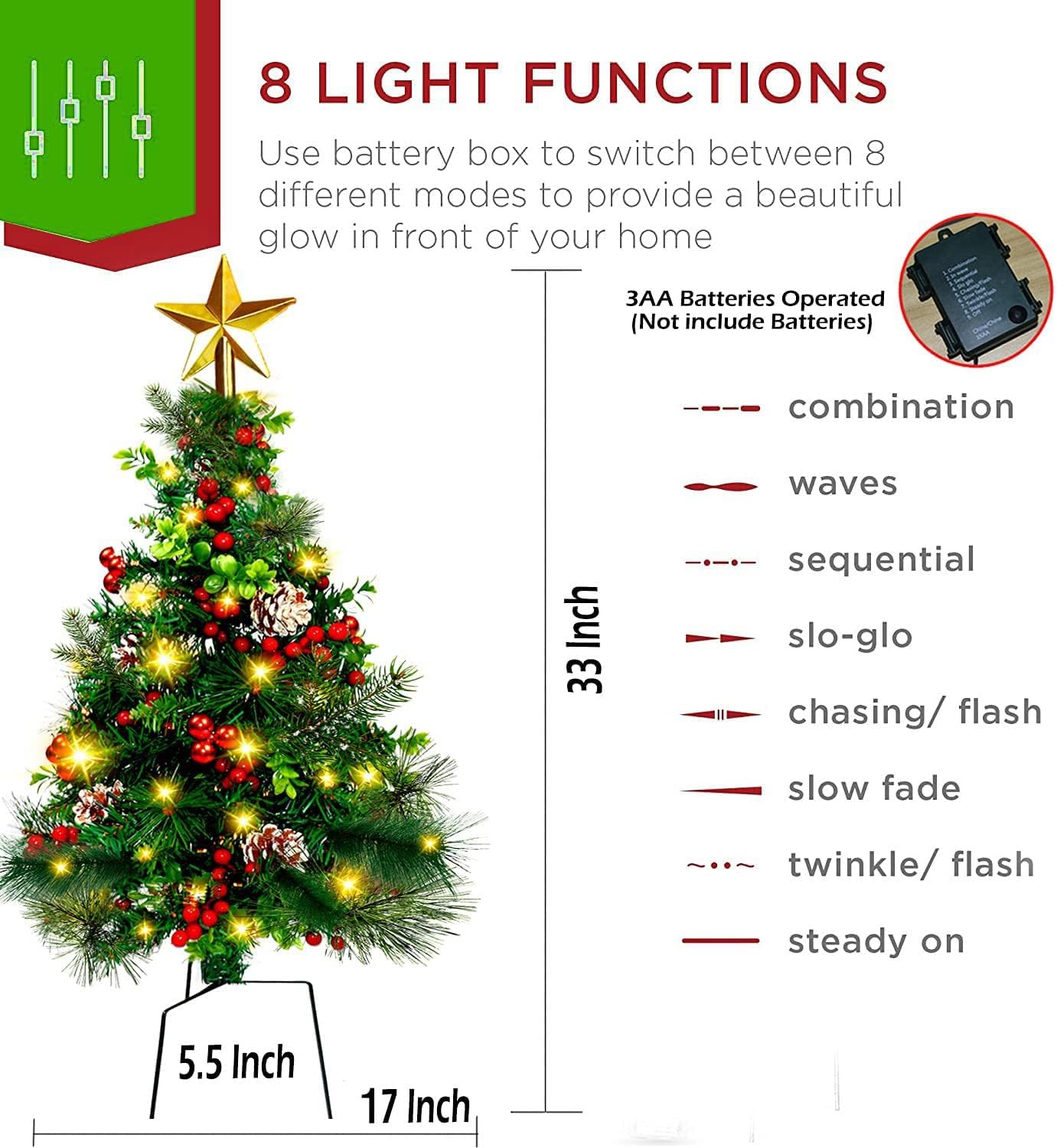 ✅8 MODE LIGHTS: 60 warm white lights are pre-LIT in each tree to save time decorating while using 8 light sequences to illuminate. 3x AA battery powered(not include).