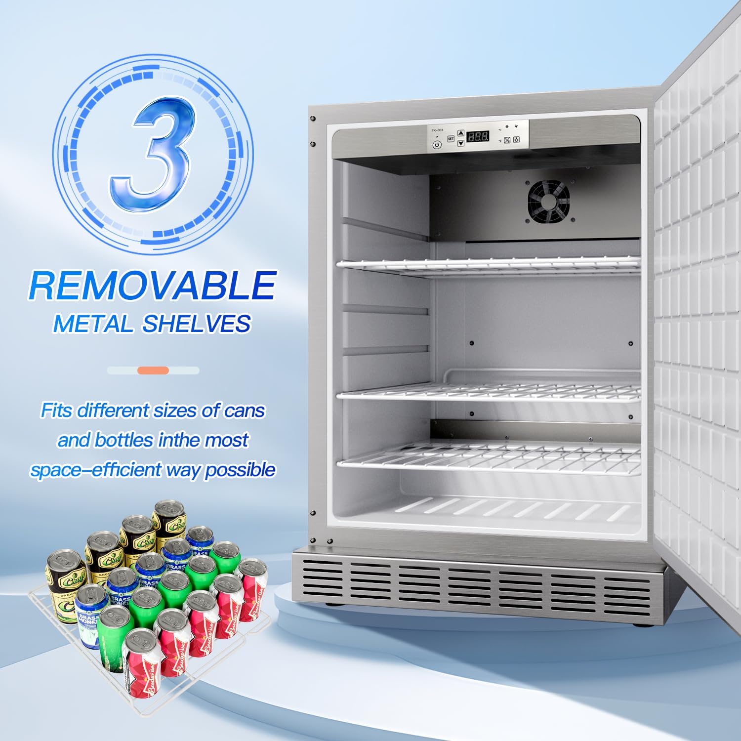 【CONVENIENT USAGE】- Fan circulated air, more evenly and efficient than cold plate cooling. Embraco compressor, together with 100W cooling power, works stably and efficiently while saving energy. Chrome plated 3-layer shelf design, position can be adjusted according to your own need without effort, thus allowing improved flexibility. Auto-defrost function included.