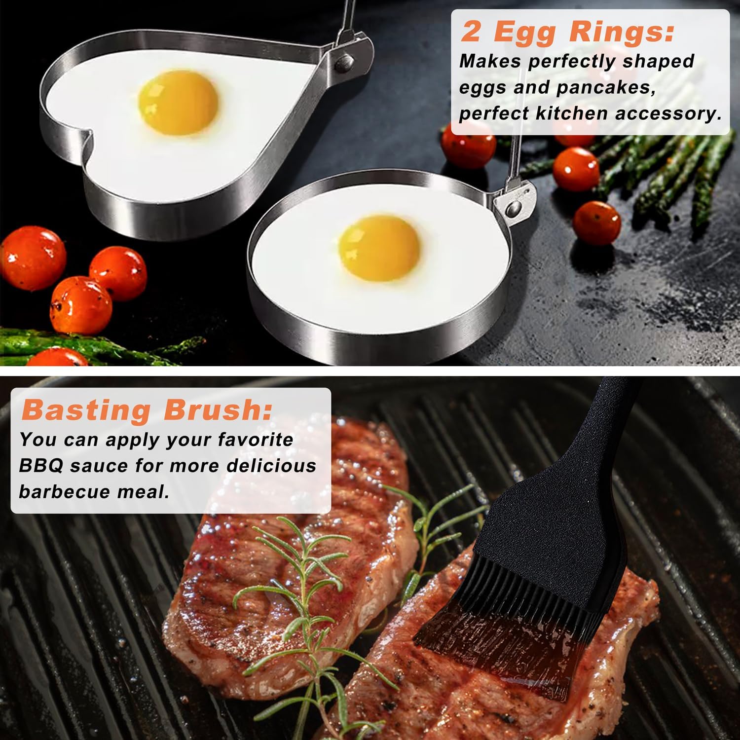 【COMPLETE GRIDDLE SET】 This griddle set comprises a comprehensive range of griddle utensils, encompassing 1 large griddle spatula, 1 slotted spatula, 1 burger spatula, 1 griddle scraper, 1 grill chopper, 1 BBQ tong, 1 basting brush, 1 cleaning brush, 2 egg rings, 1 basting cover, as well as 2 salt shakers and squeeze bottles each; in addition to 10 hanging hooks and storage bag.
