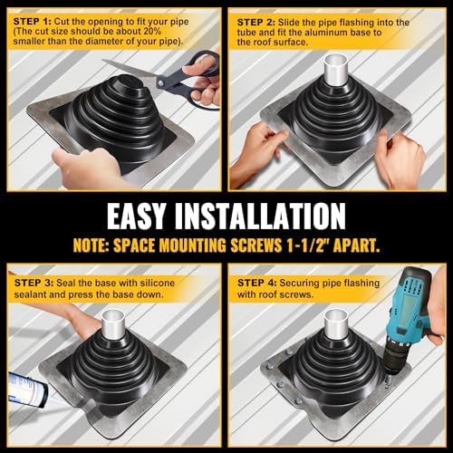 【#3 SQUARE PIPE FLASHING】#3 Metal roofing pipe flashing is suitable for 1/4″-5″ OD pipe. The rubber pipe boot can be cut to size easily. Please make sure to buy the right size pipe boot and don’t over tighten screws.