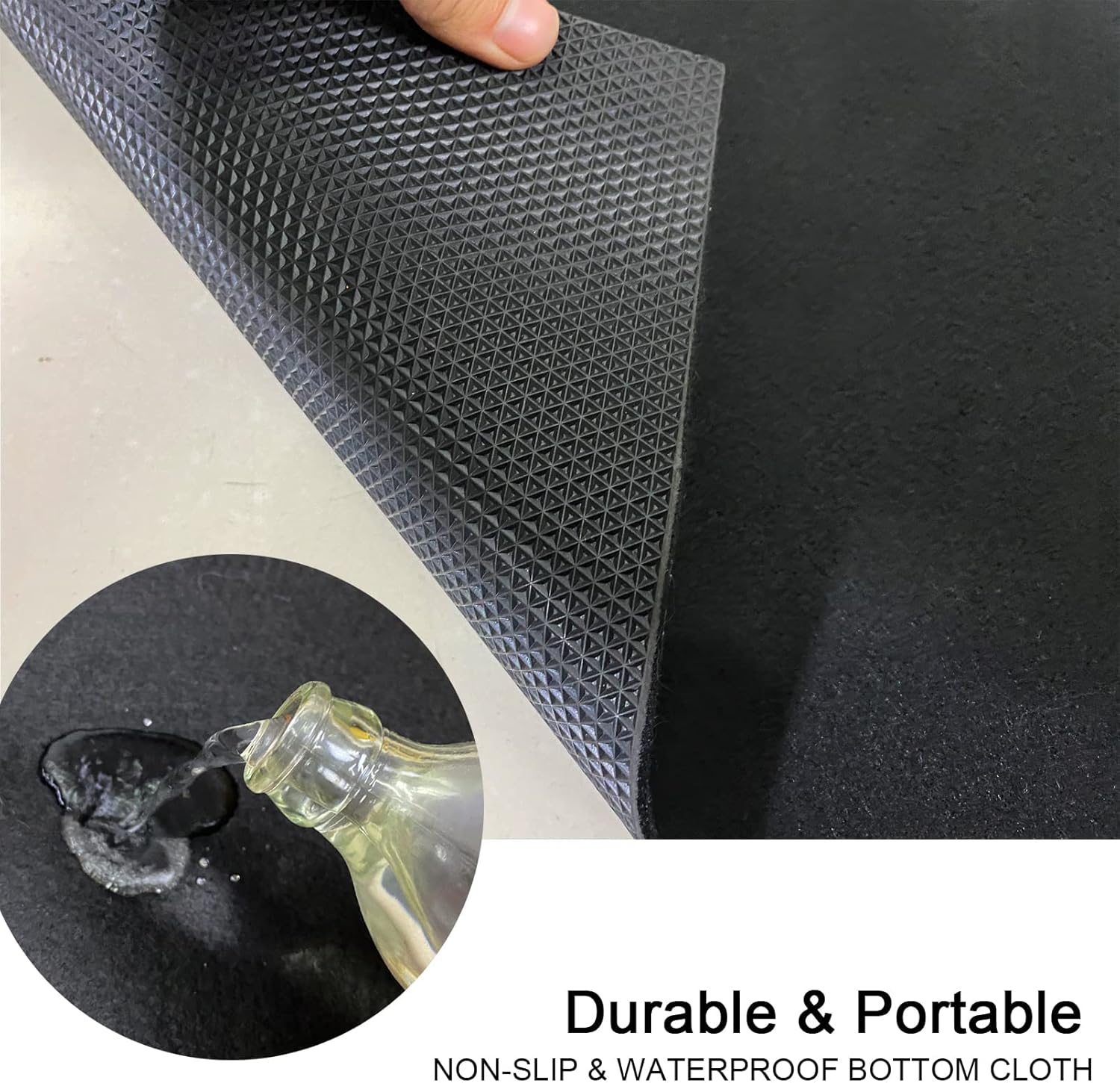 NON-SLIP & WATERPROOF BOTTOM CLOTH: The non-slip bottom cloth fixes the barbecue mat on the deck or terrace to prevent it from moving. The waterproof layer prevents the barbecue mixture from overflowing, and prevents any liquid or oil from penetrating and protecting the floor from damage.