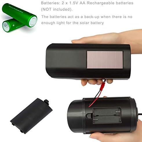 Solar Powered – with an integrated solar panel, the fake security camera can automatically charge for rechargeable batteries (NOT Included) in a well-lit environment during the day. 2x AA batteries act as a back-up when there is no enough sunlight or in the night.