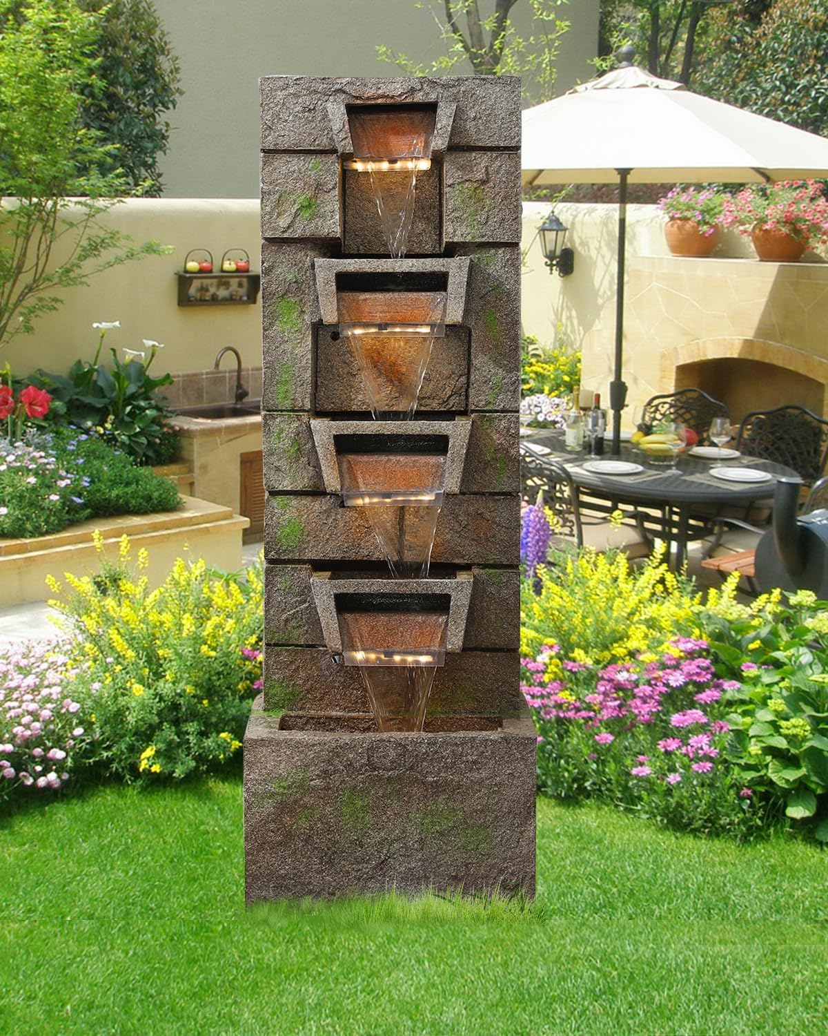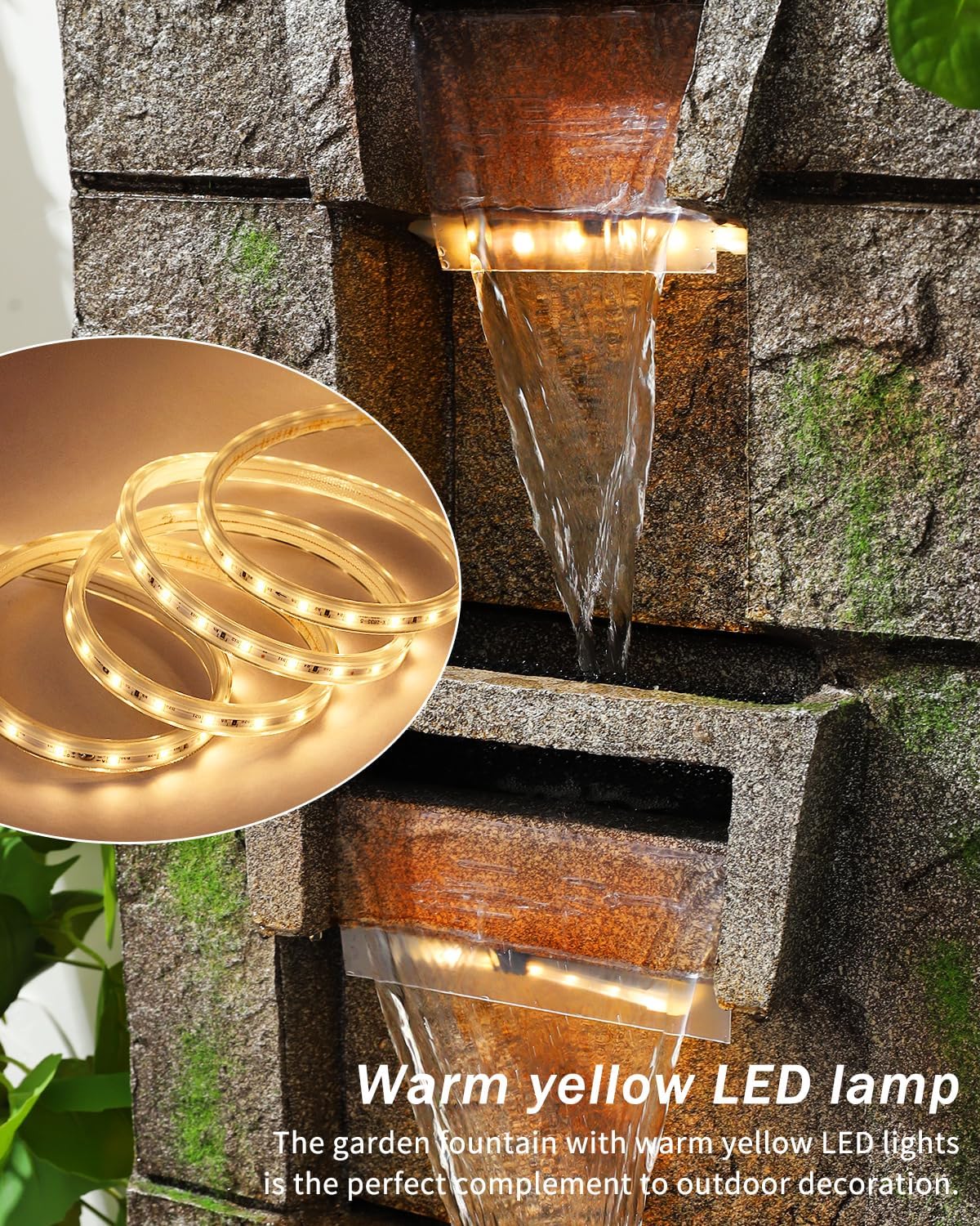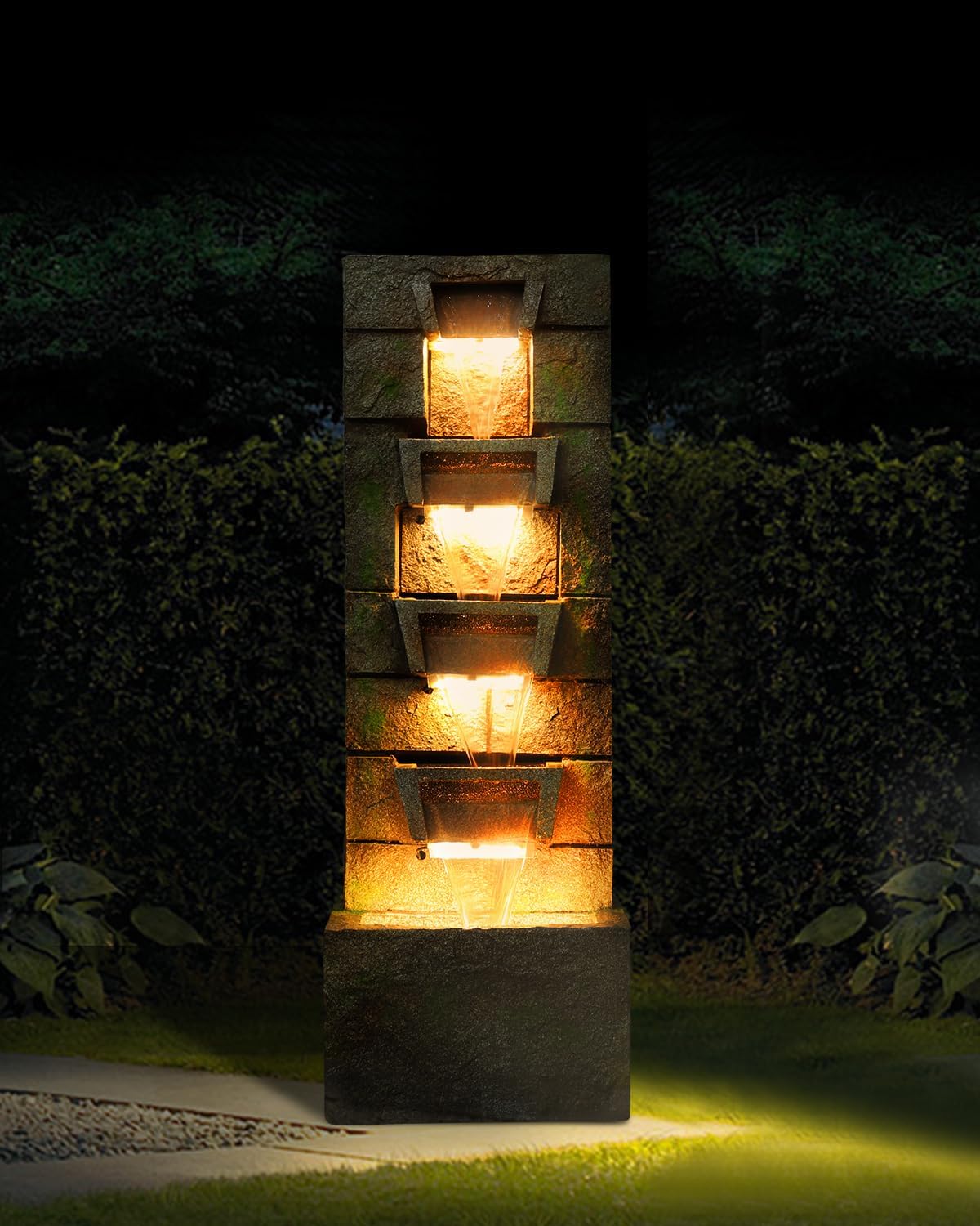 41.1″ Water Fountain Outdoor Floor-Standing Garden Fountain Modern Waterfall Fountain with LED Lights 4 Tier Rock Fountain for Porch, Patio, Garden, Backyard, Yellow