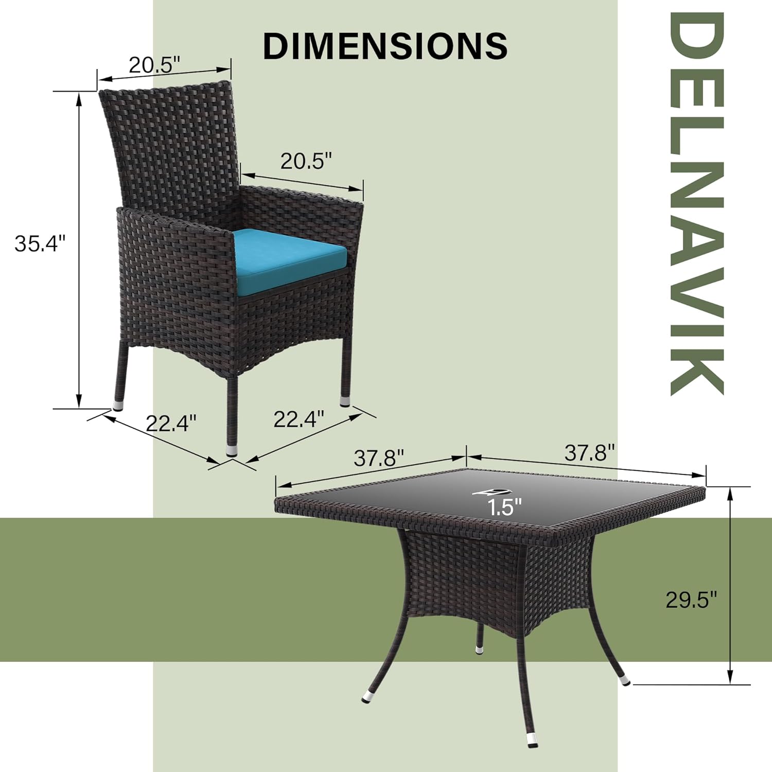 Modern Patio Dining Set: Delnavik patio 5-piece wicker dining set constructed of hand-woven weather-resistant PE rattan, makes this kind of chair can withstand the test of time and sunshine completely. The cushions are made of premium upright cotton, providing great comfort