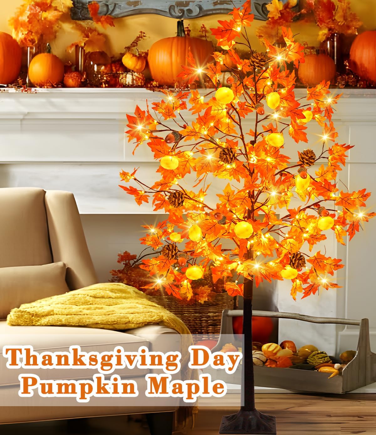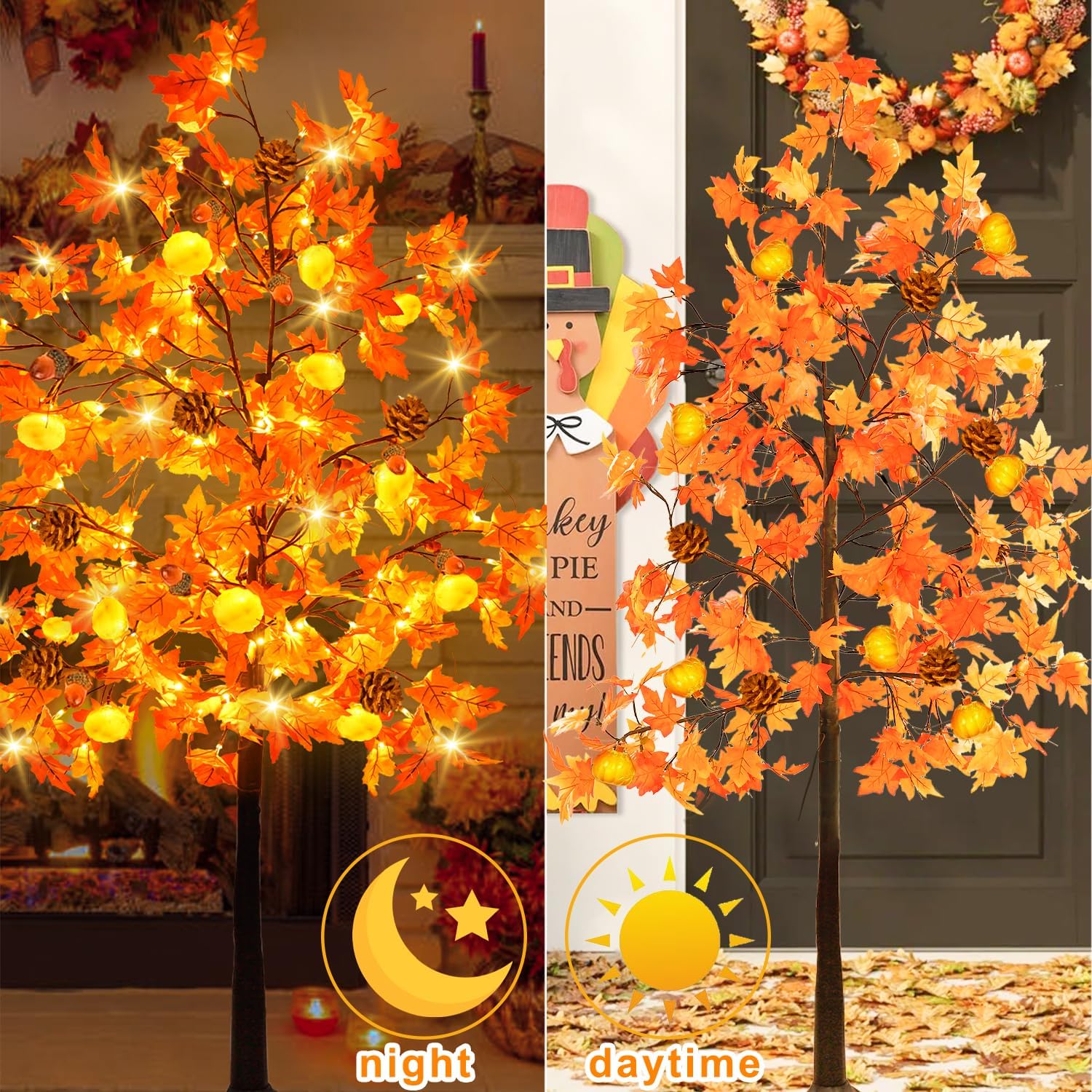 6 Ft Lighted Prelit Maple Tree Thanksgiving Decor 112 Warm White LEDs with 12 Pumpkin 8 Acorns 4 Pine Cones Lights Timer Home Indoor Outdoor Autumn Thanksgiving Decorations Artificial Tree Harvest