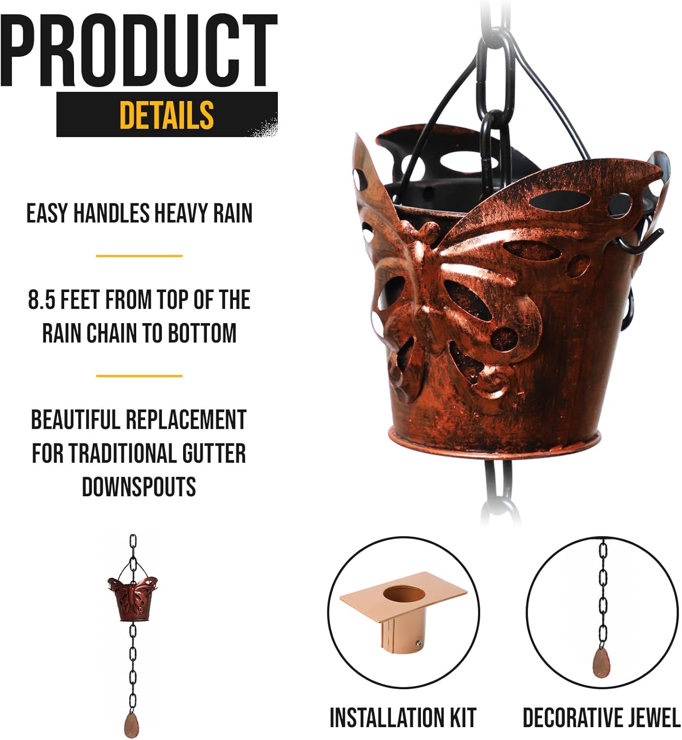 8.5FT Butterfly Bronze Iron Rain Chains for Gutter and Rain Barrel | Rust-Resistant Plated Garden Décor Rain Chain for Downspout | Bonus Rain Chain Gutter Adapter