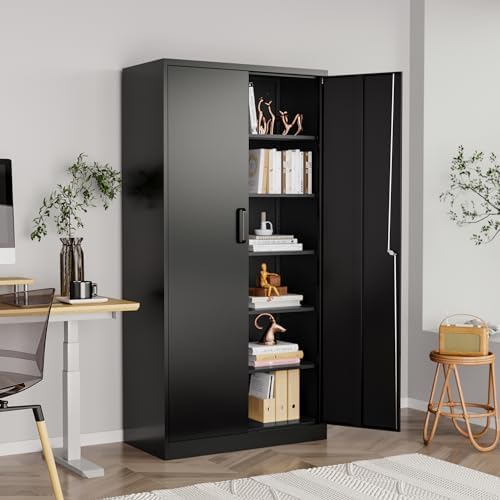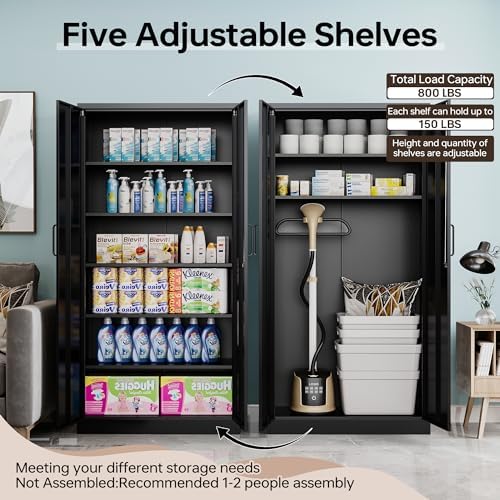 AFAIF Metal Garage Cabinets, 72″ Tall Locking Storage Cabinets with 2 Doors and 5 Adjustable Shelves, Steel Utility Tool Cabinet, Black Lockable Outdoor Storage Cabinet for Pantry, Garage, Home Office