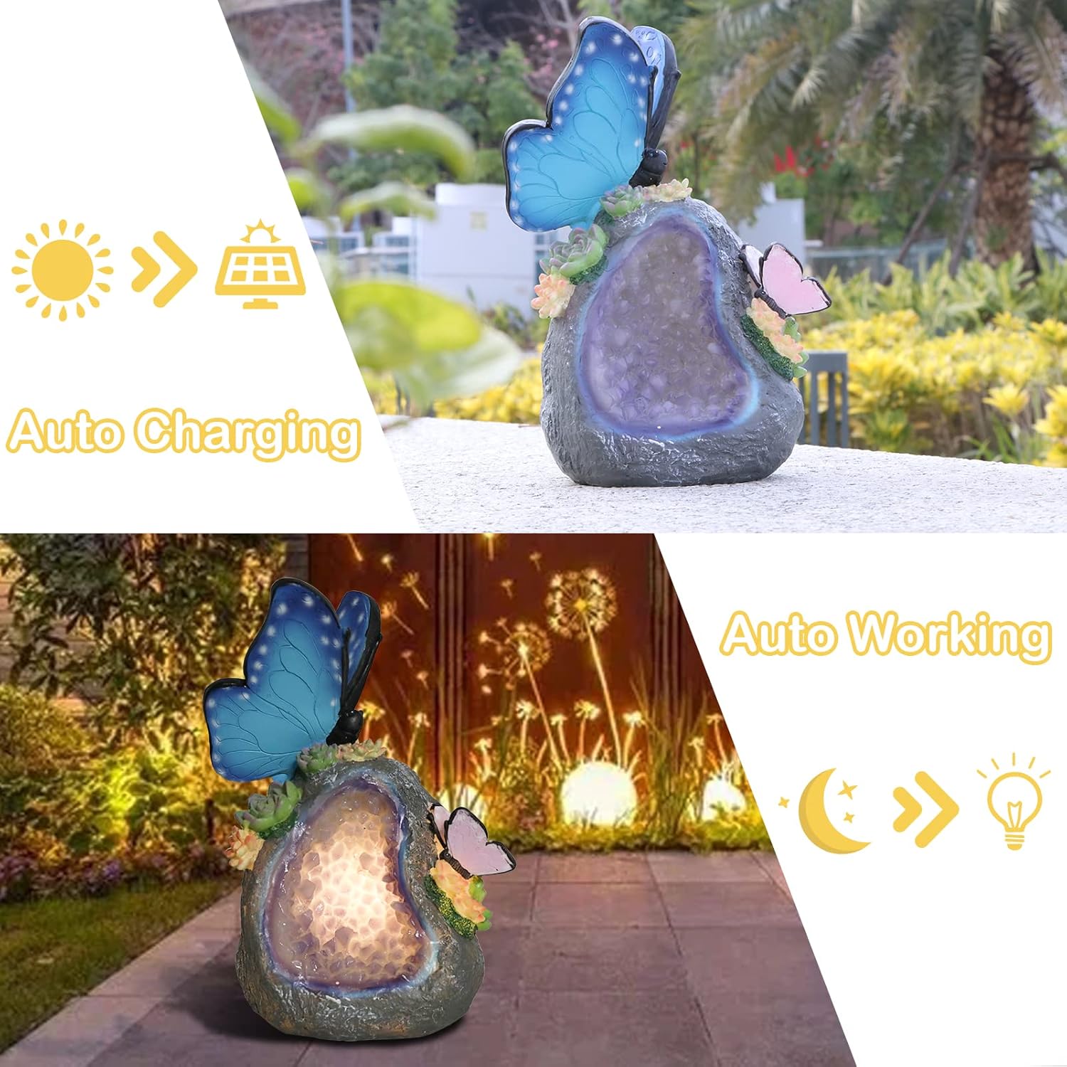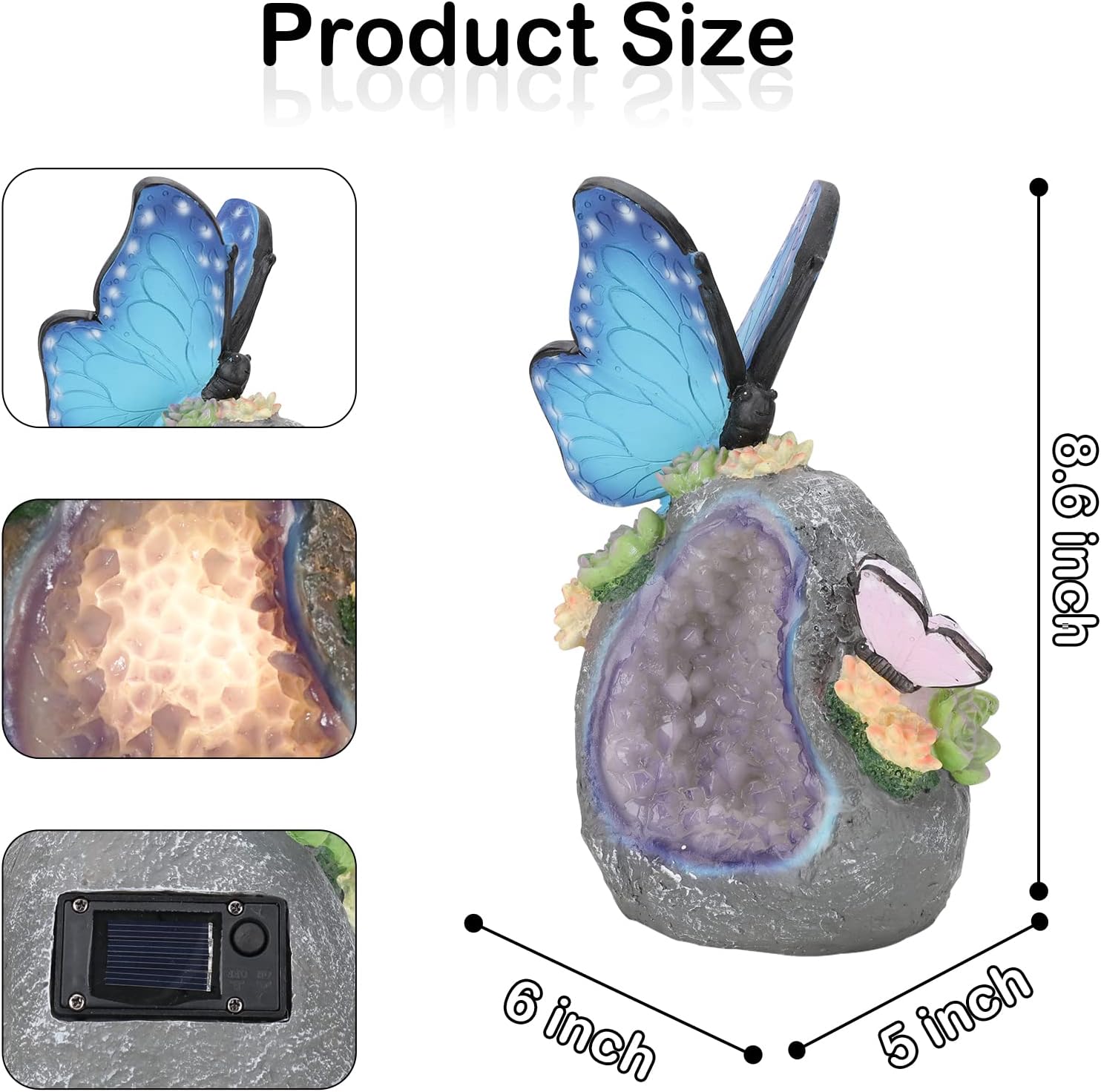 Afirst Solar Garden Statues Figurines – Outdoor Garden Butterfly Statue Resin Geode Stone with Solar LED Lights for Patio Balcony Lawn Ornament Gifts