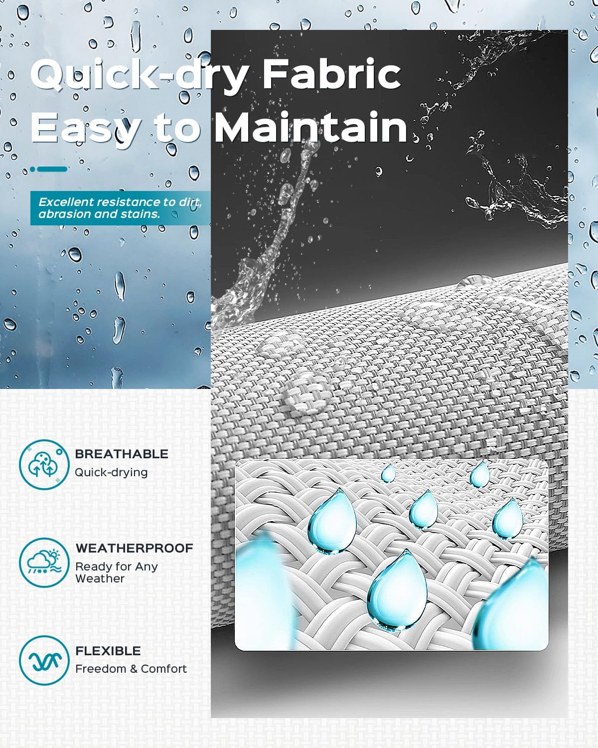 【EASY MAINTENANCE】 This chaise lounge features a sturdy aluminum frame and premium Texitilene fabric, which is not only durable but also resistant to various weather conditions. The Texitilene fabric is a lightweight material that is breathable and quick-drying, allowing air to circulate and ventilate body heat on hot days.