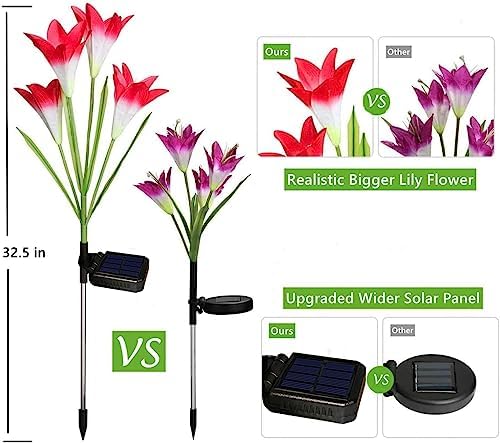 🌷Hold Up in Bad Weather: These IP65 waterproof solar lily lights are durable enough to be left outdoor, they will be functioning in all weathers and keep lighting. Aluminum alloy stake firmly holds the solar lights in ground, avoiding breaking and missing in windy weather.
