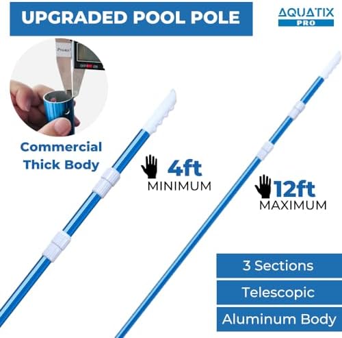 Aquatix Pro Swimming Pool Pole, 12 Foot, Commercial Thickness, Strong Holding Power, 3 Section 4-12ft Extendable Aluminium Telescopic Pole for Skimmer Nets, Vacuum Heads, Brushes, Grip & Lock