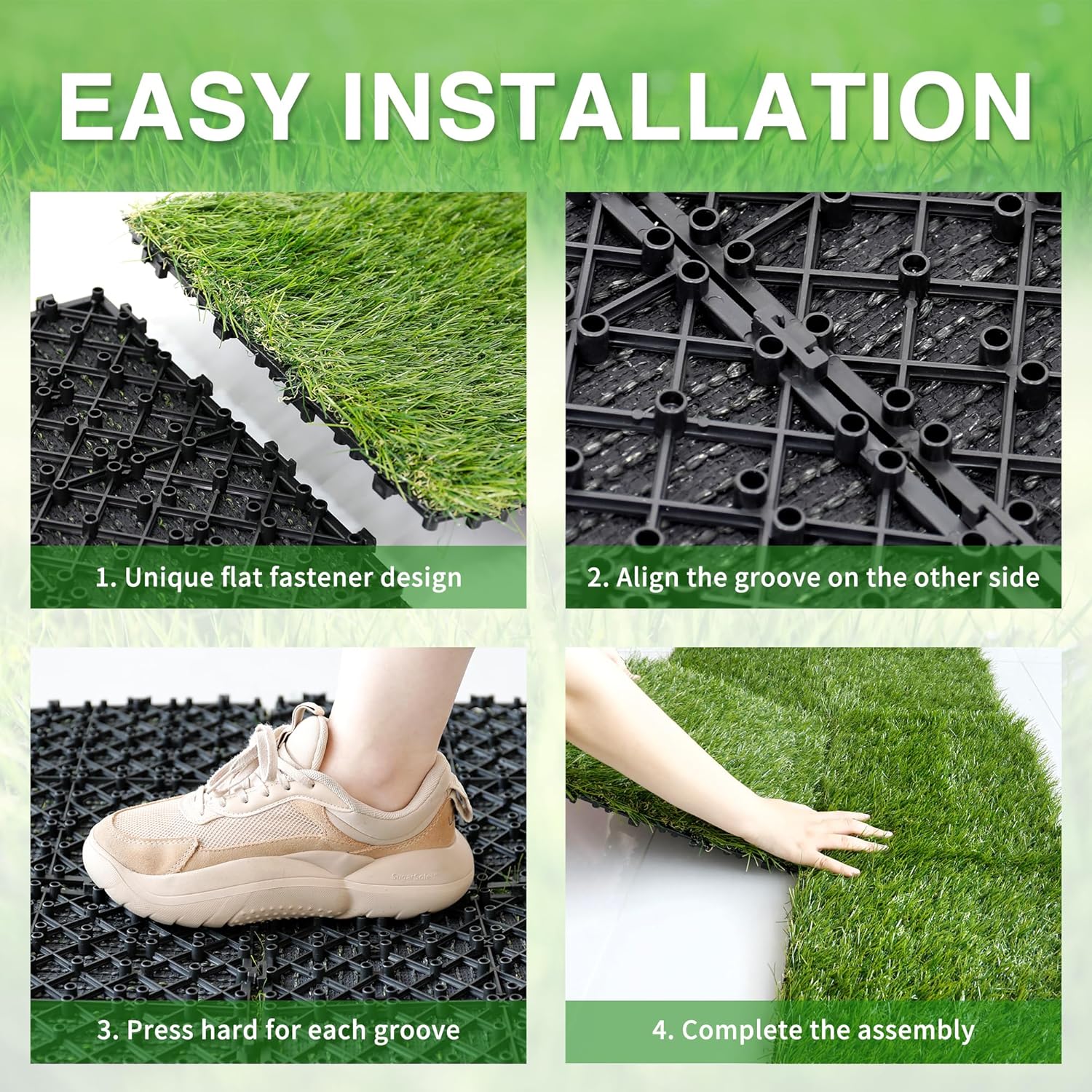 🍀【Great Material】- You will receive 9PCS 12”x12” artificial grass mats,1.57 inch thick with drainage holes. All of our grass turf is made of advanced UV resistant yarns, polyethylene fabric and durable PP backing with lock-in system. High quality synthetic material,against undue fading and fiber degradation.