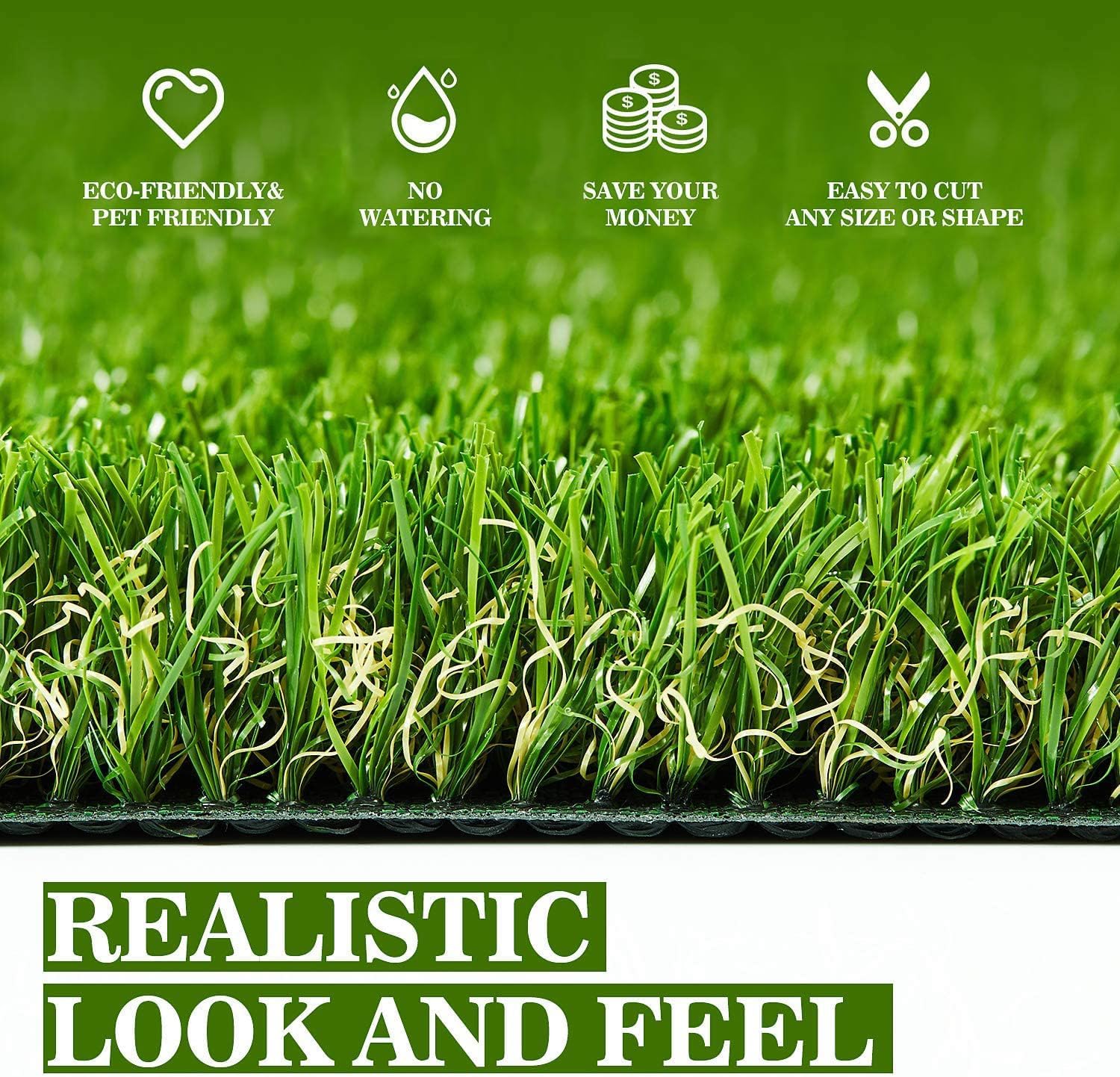 HIGH QUALITY MATERIAL – Reject the cheap and harmful materials! Our artificial grass turf is made of premium Synthetic material which features non-toxic, it¡¯s totally eco-friendly and safe for pets, human beings even toddlers, soft and the natural green makes the artificial grass just like the real grass.