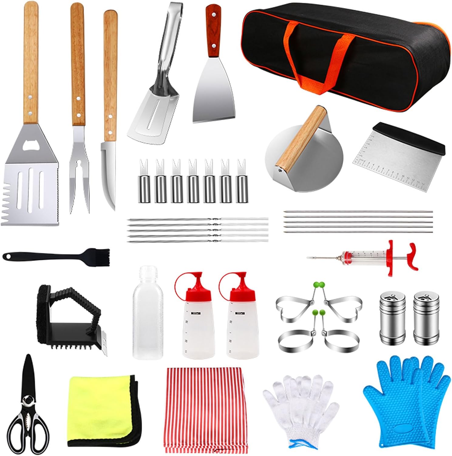 39 Pieces Griddle Accessories: BBQ set includes tooth spatula*1, beveled edge scraper*1, spatula*1, iron plate press*1, bread clip*1, scissors*1, squeeze bottle*2, egg ring*4, cleaning brush*1, spice bottle*2, sauce brush*1, silicone gloves*1, apron*1, crowbar*10, corn holder*8, grease bottle*1, towel*1, mitts*1, and organizer*1. Meets the barbecue all needs, perfect for use with barbecue grills.