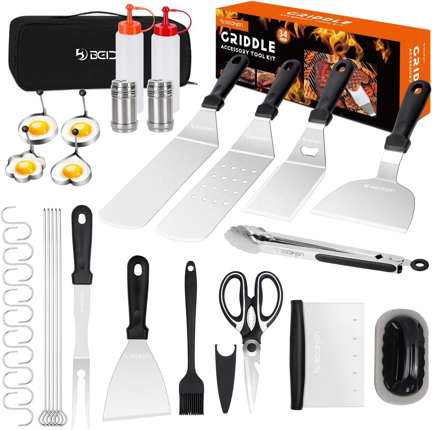 Beichen Griddle Accessories Kit, 34Pcs Stainless Steel Flat Top Grill Tools Set for Blackstone and Camp Chef, Grilling Spatula Set, Scraper, Carry Bag, Grill Cleaning Accessories for Men Outdoor BBQ