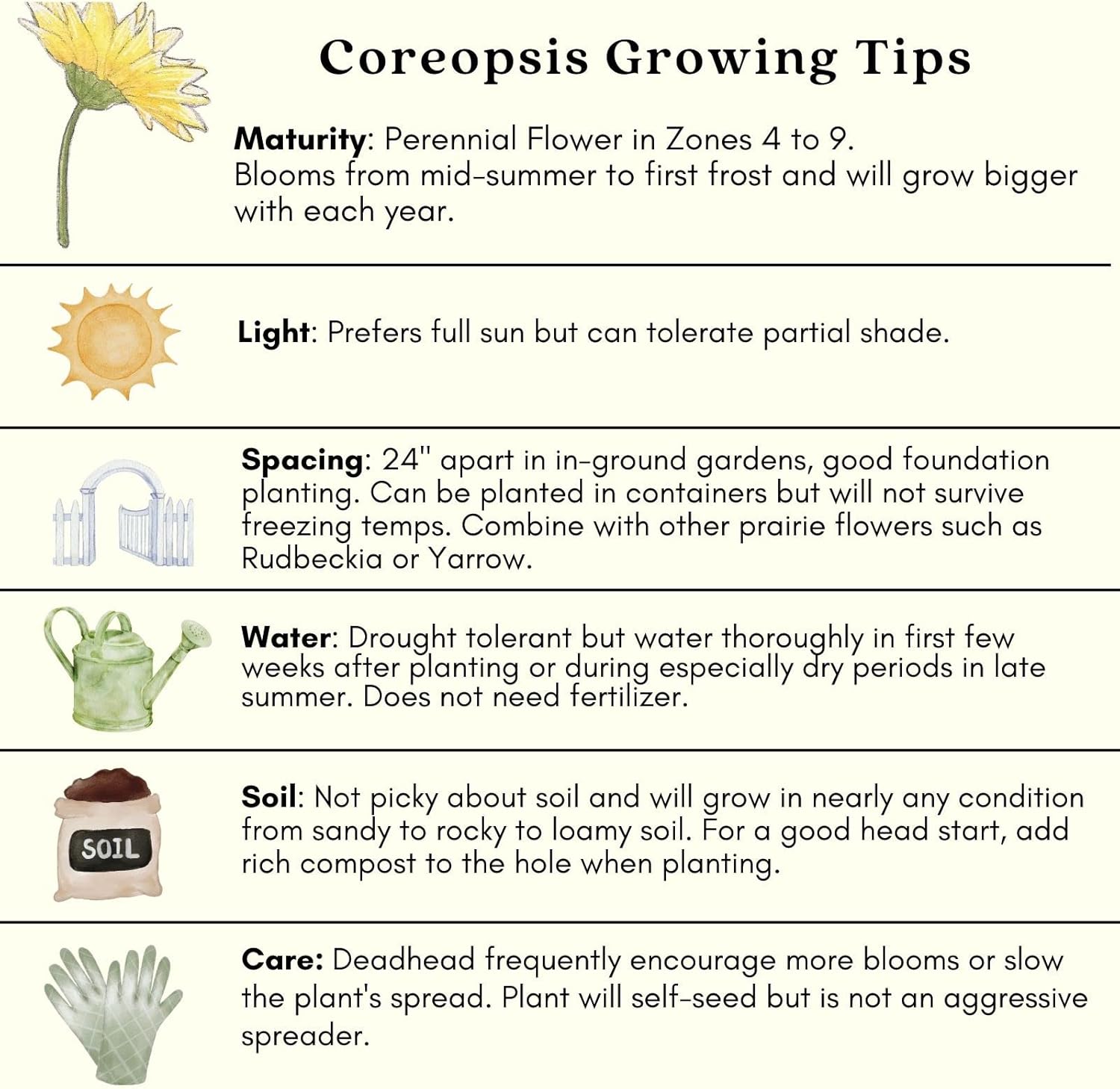 A must-have for cottage and cutting gardens, known for their bright and cheerful daisy-like flowers. The Moonbeam Coreopsis has pale yellow leaves with a darker yellow seedhead