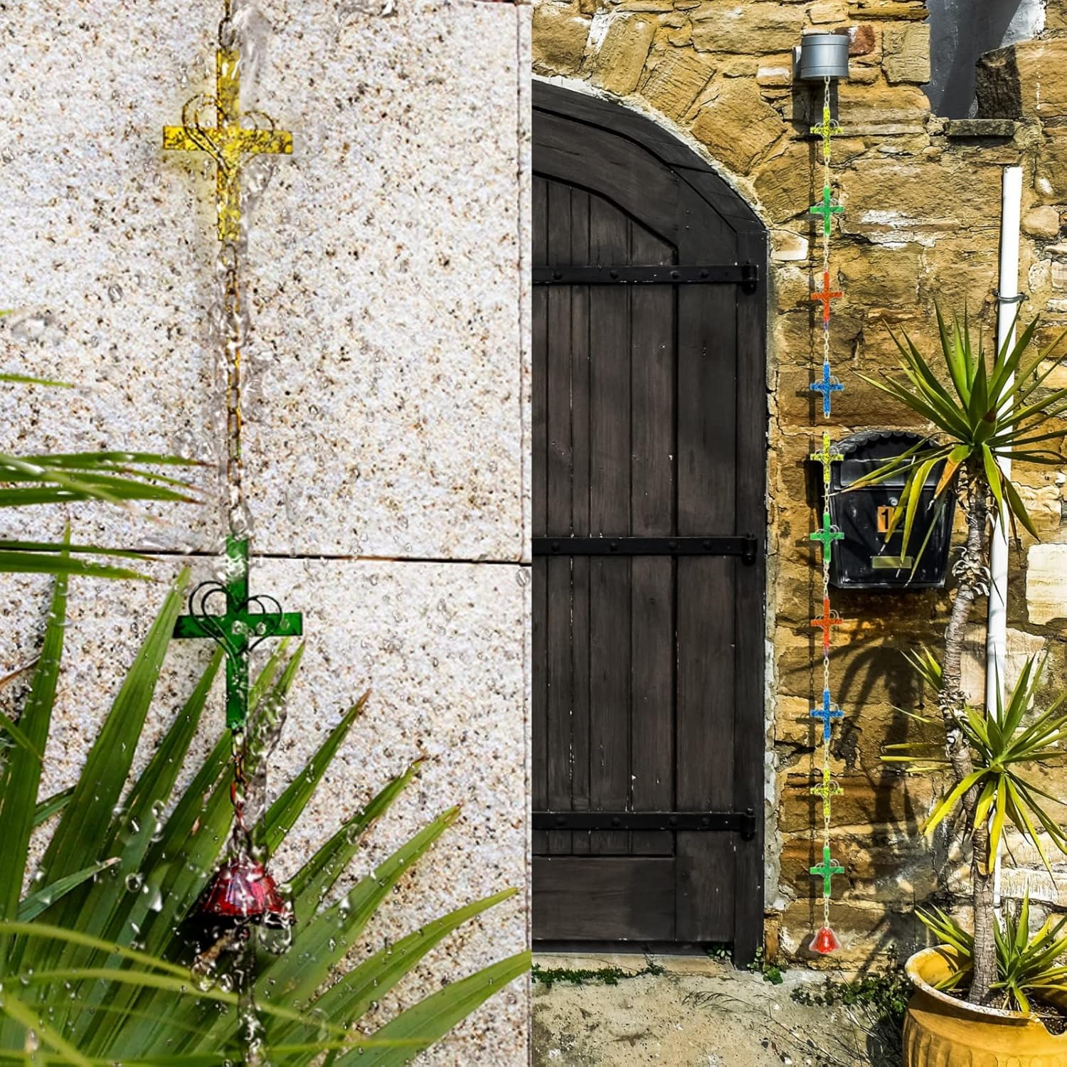 🕇 Rain Chains for Outside – The rain catcher is built up of 10 multicolor cross with heart and 1 red chime connected vertically, there are yellow, green, red, blue cross, each cross with double layer of heart upon the cross, the cute design is an eyecatching decoration for any outdoor space. This rain catcher chain combines outdoor decoration with practical drainage effect which could be an optional substitution to traditional rain gutter system.