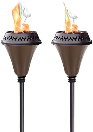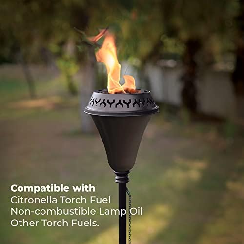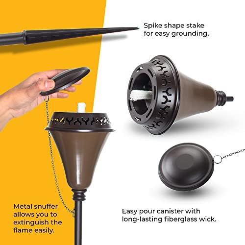 FIBREGLASS WICK & SNUFFER: Each torch comes with an extra-large fiberglass wick that offers better fuel flow and keeps your flame lit longer than regular cotton wicks. These decorative outdoor garden torches also come with an attached metal snuffer to easily & safely extinguish flames when you need.