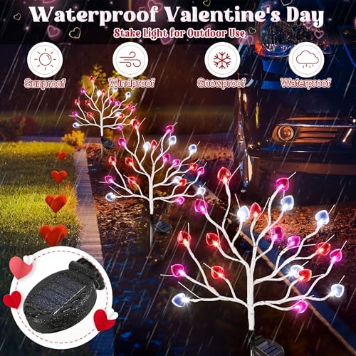 ❤️2 Pack Solar Valentine’s Day Lawn Light: the solar heart stake light outdoor waterproof is made of quality PVC material, more durable and not easy to get rust; The maintenance free solar lawn light is easy to assemble, with no wiring or external power required, simply assemble the tree light and stake and find the solar panel switch and turn it on, finally plug it into the soil to decorate your garden; The 2 piece design adds to your festive atmosphere