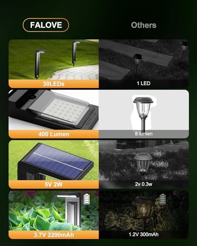 400 Lumen Super Bright LED Solar Pathway Lights: FALOVE 30 LEDs outdoor solar lights, the new design in 2024! 1 pack FALOVE black solar path lights is brighter thank 20 pack path lights from other brand. It only takes 2 lights to light up your pathway, really saves your money. Warm Tips: Please push the switch to “ON” and install the solar lights under direct sunlight for charging 1 day before the first time you use them.