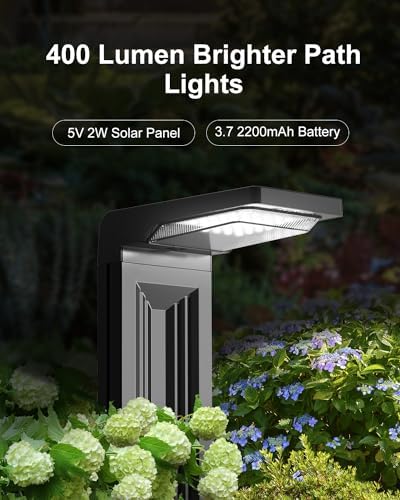12 Hs Lighting & 2 Brightness Modes: With a 10-12 hours long illumination time on a full charge with low(200Lumen) brightness mode, 6-8 hours for high(400lumen) brightness mode. These outdoor lights for yard provide consistent and reliable brightness throughout the night, the strong power from 2200 mAh big rechargeable battery. Say goodbye to long charging times as our lights with 5V 2W large solar panel, recharge fully in just 5 hours under direct sunlight.