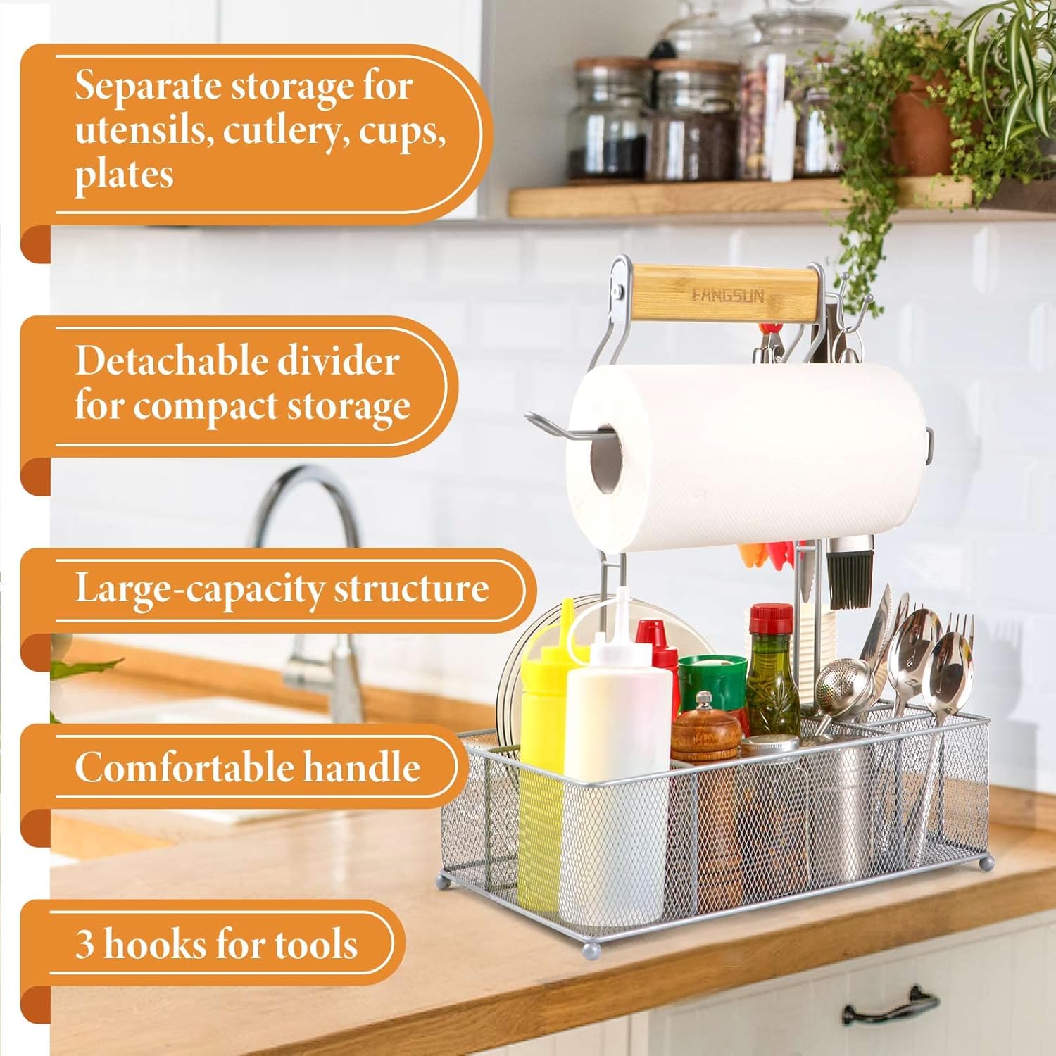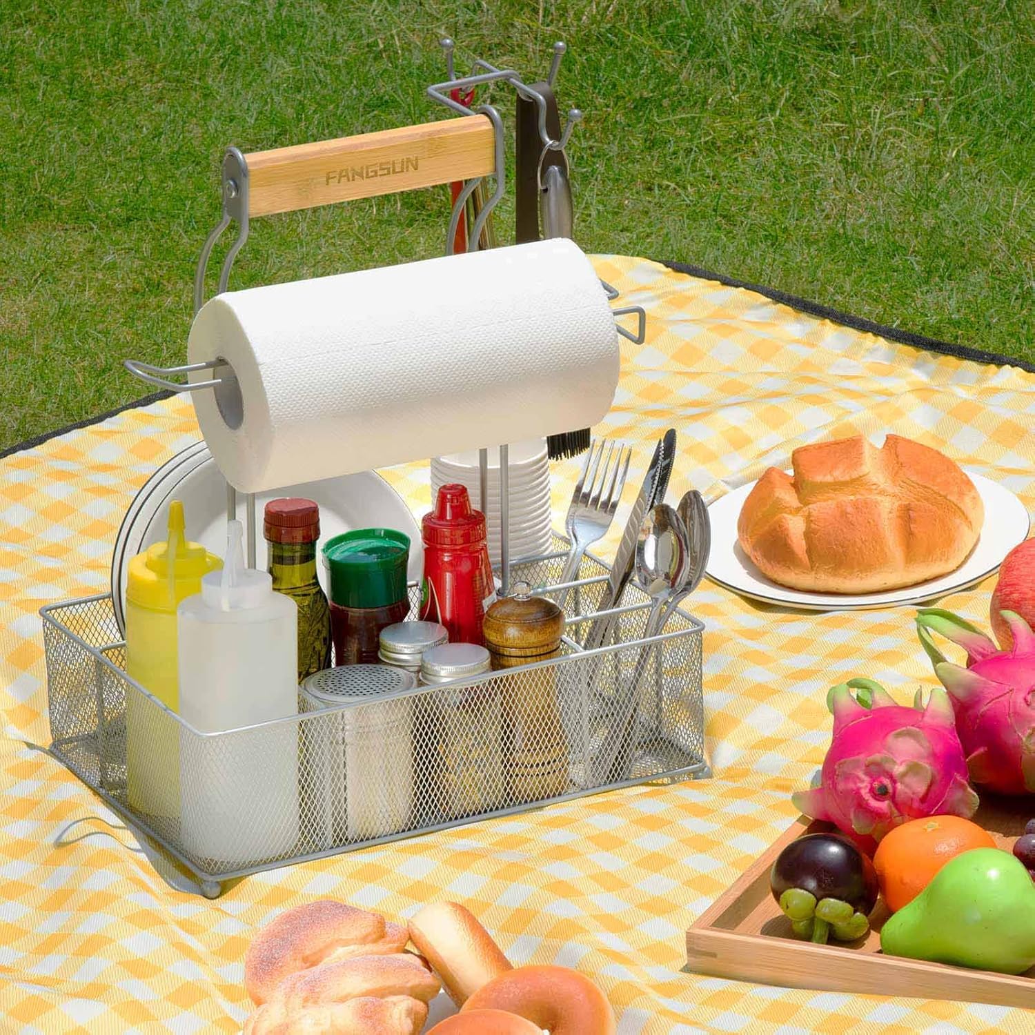 FANGSUN Grill Caddy, BBQ Caddy with Paper Towel Holder, Picnic Condiment Utensil Caddy for Outdoor Camping, Barbecue Accessories Storage Organizer for Griddle Grilling Tool, Rv Patio Camper Must Haves