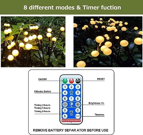 8 Lighting Modes – Solar swaying lights are designed with 8 lighting modes, it can create different lighting atmospheres when you select different modes–1.Combination 2.In wave 3.Sequential 4.Slo glo 5.Chasing/Flash 6.Slow fade 7.Twinkle/Falsh 8.Steady on.Use the remote control to switch between different modes and enjoy the atmosphere of fireflies flying!