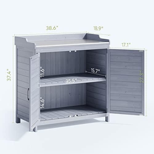 Gizoon Outdoor Potting Bench with Metal Tabletop, Double Doors Garden Potting Table with Adjustable Shelf, Wooden Planting Table Potting Stand for Backyard, Patio, Lawn -Grey