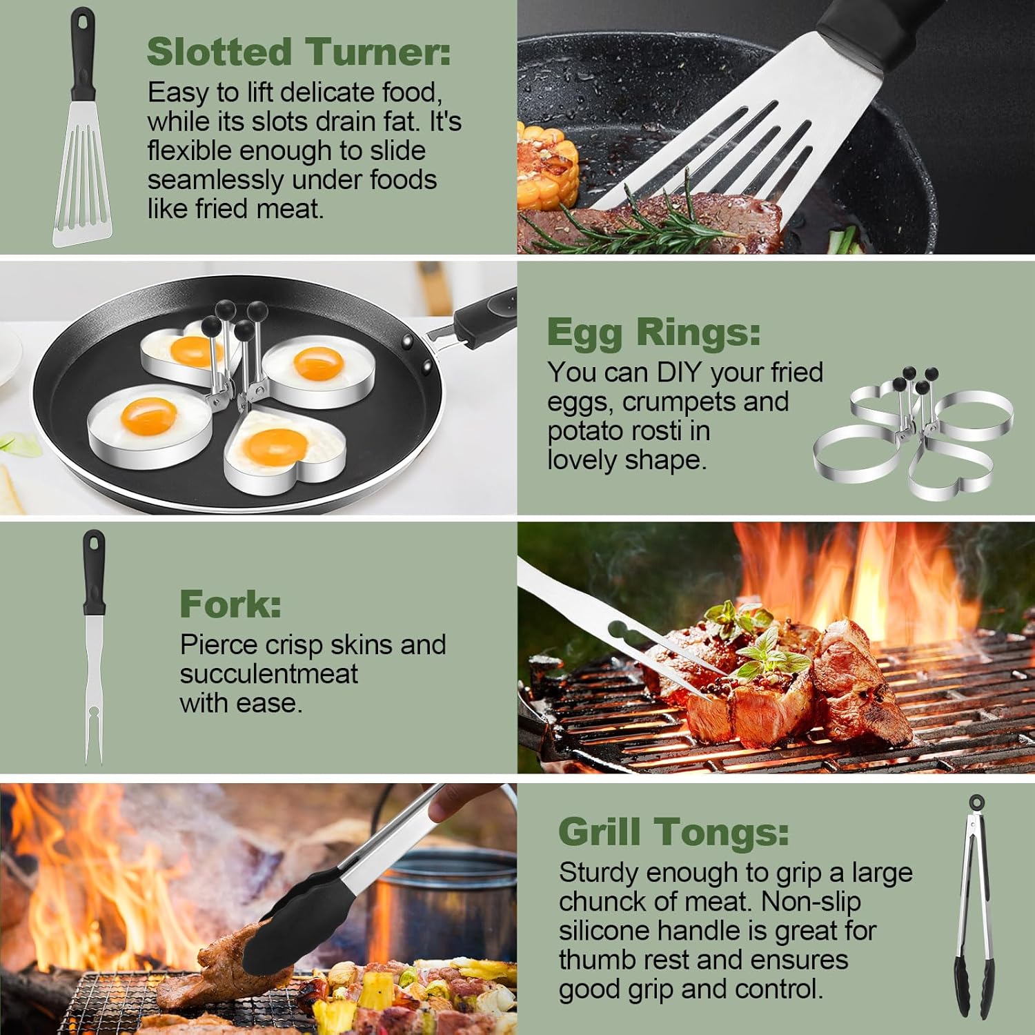 【Perfect 43pcs BBQ Accessories】This griddle accessories kit includes: 1* long griddle spatula, 1* slotted spatula, 1* slant edge scraper, 1* slotted turner, 1* fork, 1* grill tongs, 8* kabob skewers, 1* sauce brush, 1* chopper, 4* corn holders, 2* squeeze bottles, 4* egg rings, 10* hanging hooks, 1* meat injector, 1* meat knife, 1* basting cover, 2* spice shakers, 1* cleaning brush, 1* storage bag.