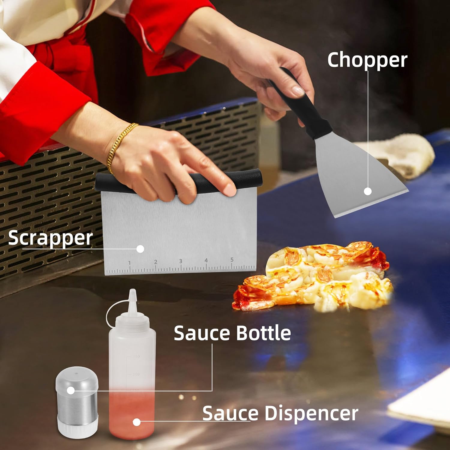 Versatile Outdoor & Kitchen Cooking Set: 2 oversized griddle spatula is great for flipping beef cubes, fried eggs, or vegetables. 1 stainless steel chopper/scraper to dice food easily and scrape griddles clean. 2 premium leak-free fine tip bottles for condiments and liquids like oil or water. Those will please everyone at your BBQ, weekend party or everyday meals