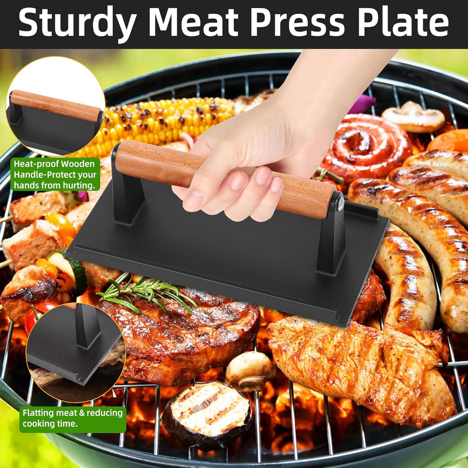The Complete Extra Tools: 2* egg rings, 2*spatula, 1* bruger press, 2*sauce bottle, 2*sauce dispence, 1* chopper, 1*scrapper, 1* griddle tong,1* suce brush, 1* spatula turner. Strong burger turner so you can use it to weigh down and evenly sear your bacon, sausages, steaks, ham, hash browns, sandwiches, or paninis; Those bbq tools will help you perform well in barbecue cooking
