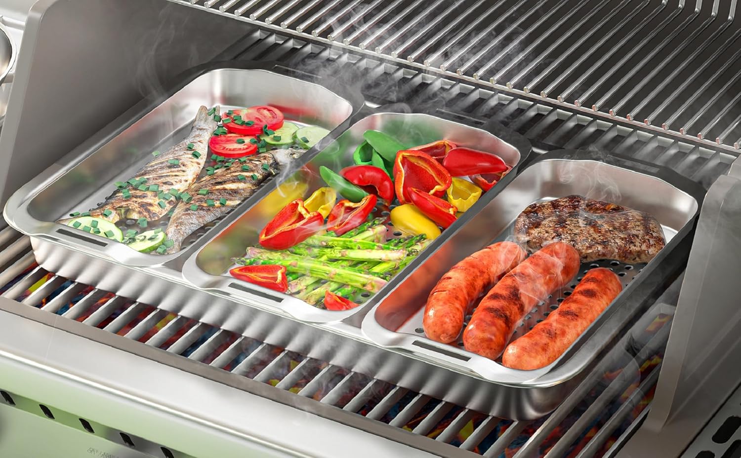 3-IN-1 SET FOR PERFECT GRILLING & SERVING: Grill your favorite veggies, seafood, and other delicacies in the separate baskets, then clip all of them on the mess-free tray and serve everything from the grill straight to the table. Each individual basket allows for even heat distribution and perfect cooking without getting all the different tastes mixed up. Ideal for serving multiple people at once!