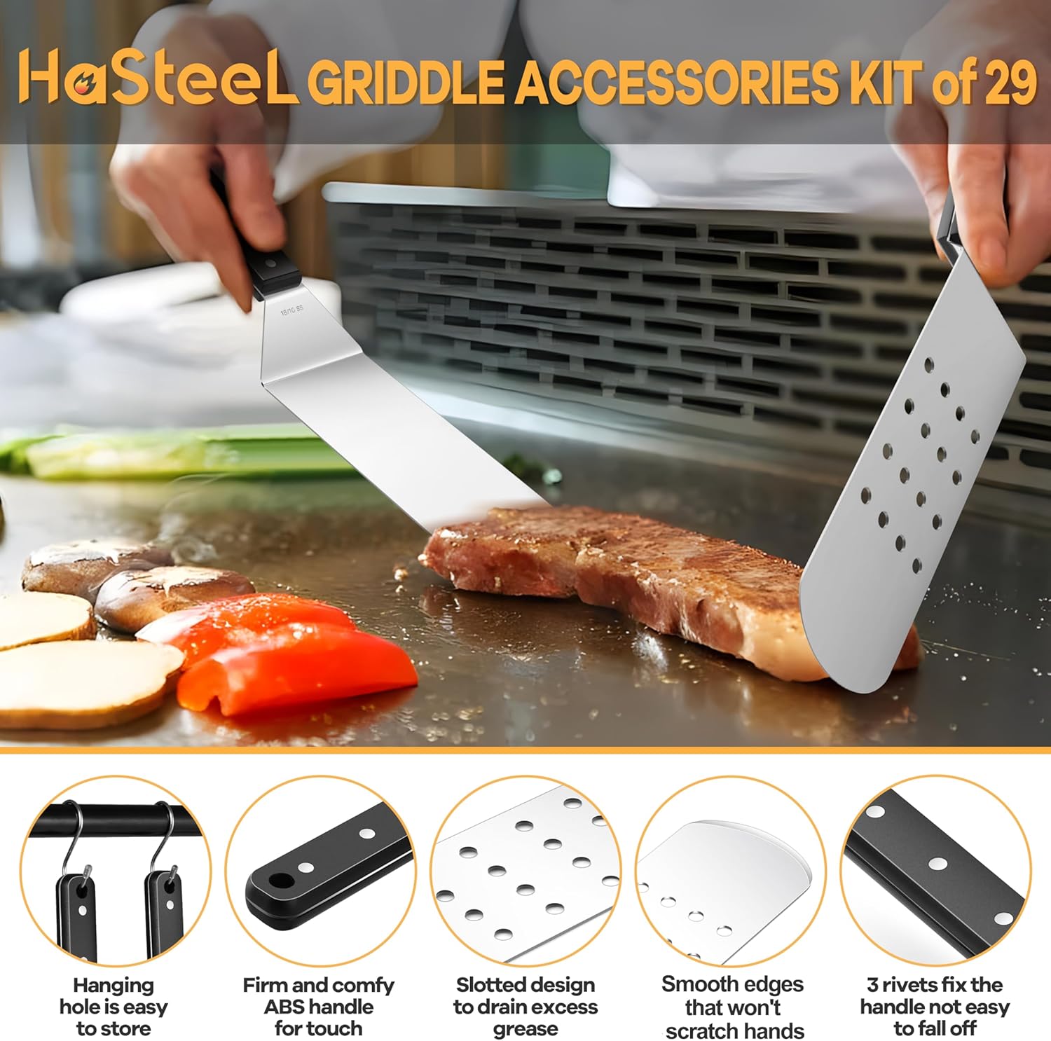 HaSteeL Griddle Accessories, 18/10 Stainless Steel Flat Top Grill Accessory Kit, Heavy Duty Metal Spatulas Scraper & Melting Dome for Outdoor & Indoor Teppanyaki Hibachi Cooking, Rust Free – 29Pcs