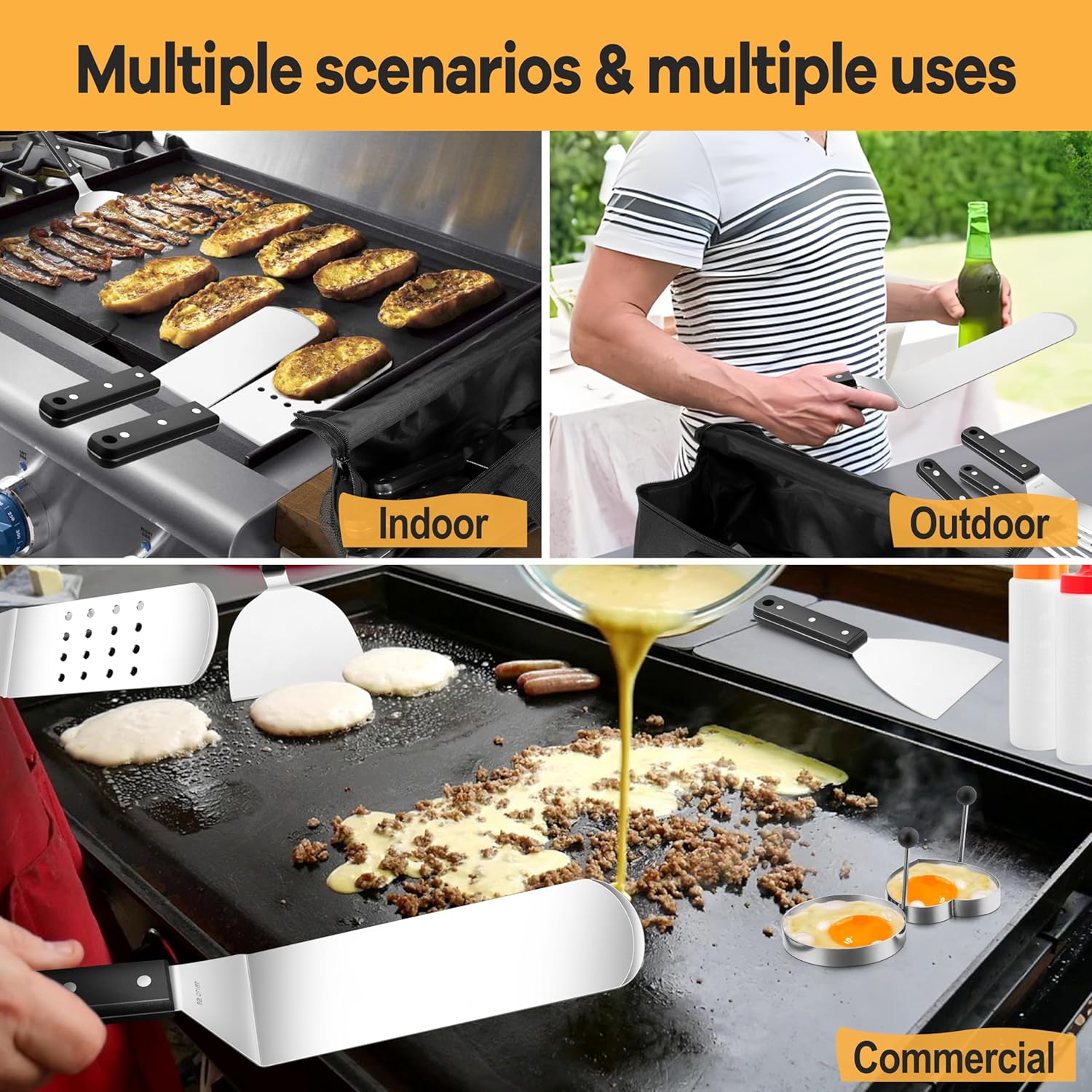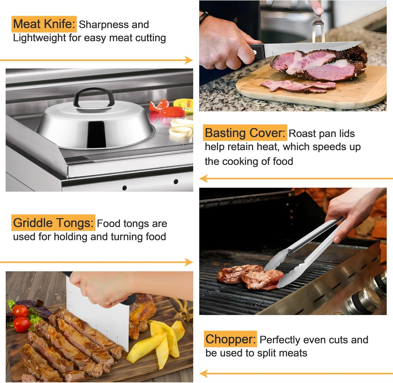 COMPLETE Griddle SET OF 29: This flattop grilling accessories set is full to meet your indoor and outdoor cooking purposes, Compatible with teppanyaki, RV, tailgating, hibachi, cast iron lodge, stove top griddle, Diverse tools can be used for different food, like fish, burgers, vegetables, bacon, steaks, ribs, eggs and more, Exquisite design and high quality make it a decent gift for family and friends
