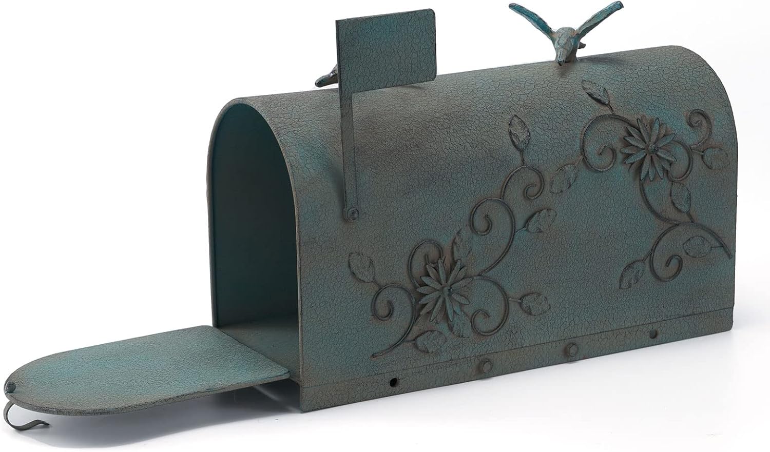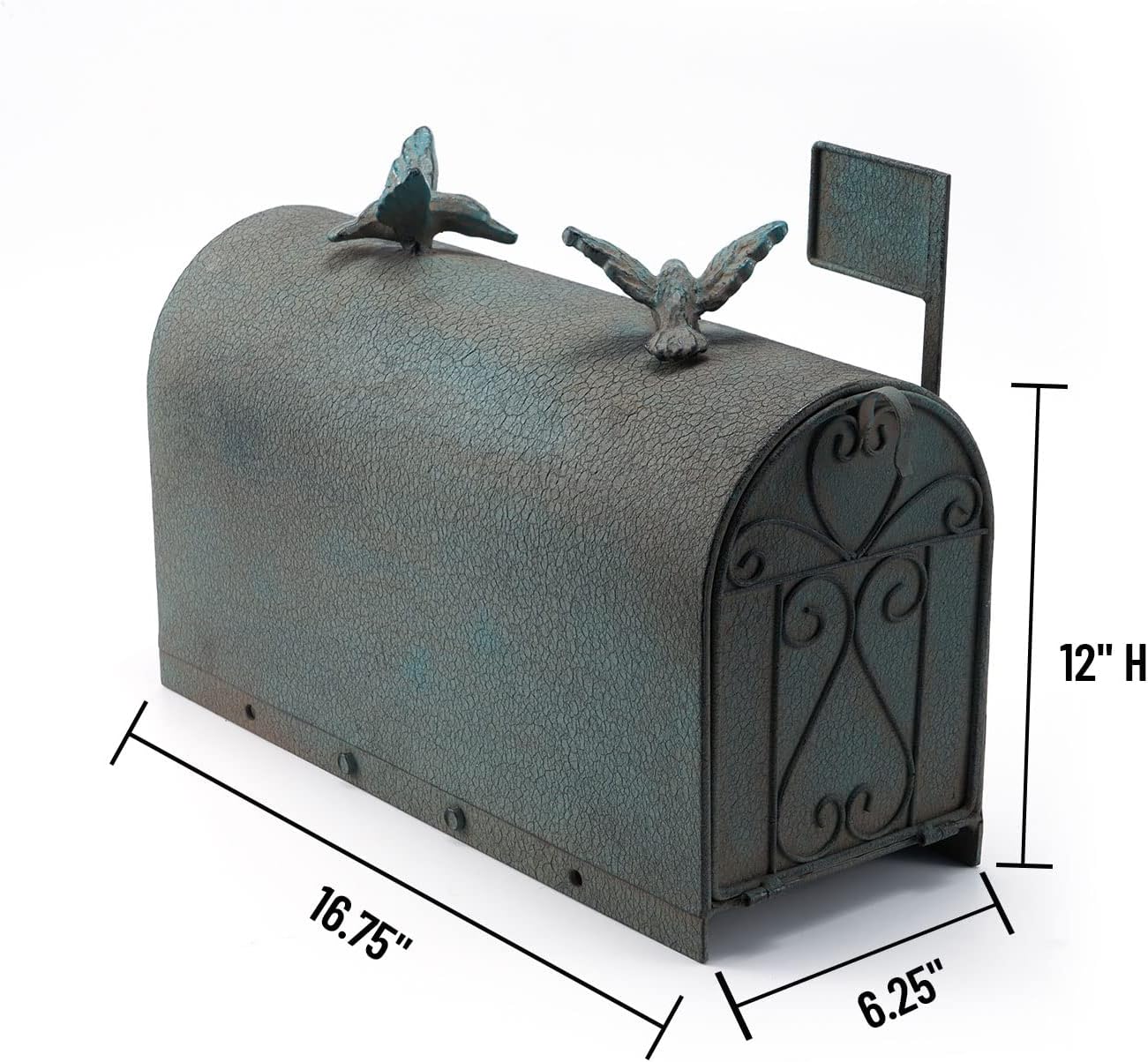 Heavy Duty Galvanized Steel Mailbox Post, Rural Mail Box Postal Storage Box with Bird Decoration (Vintage Green)