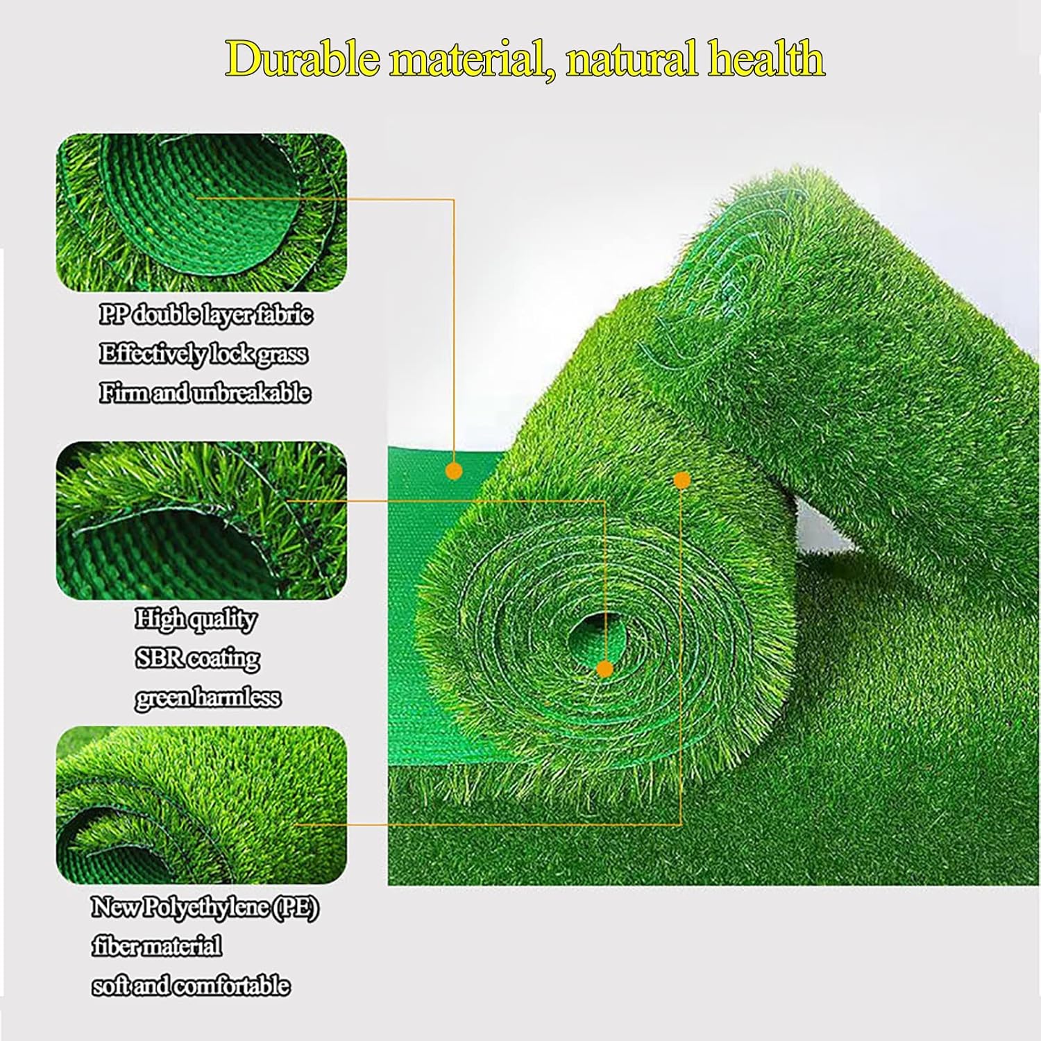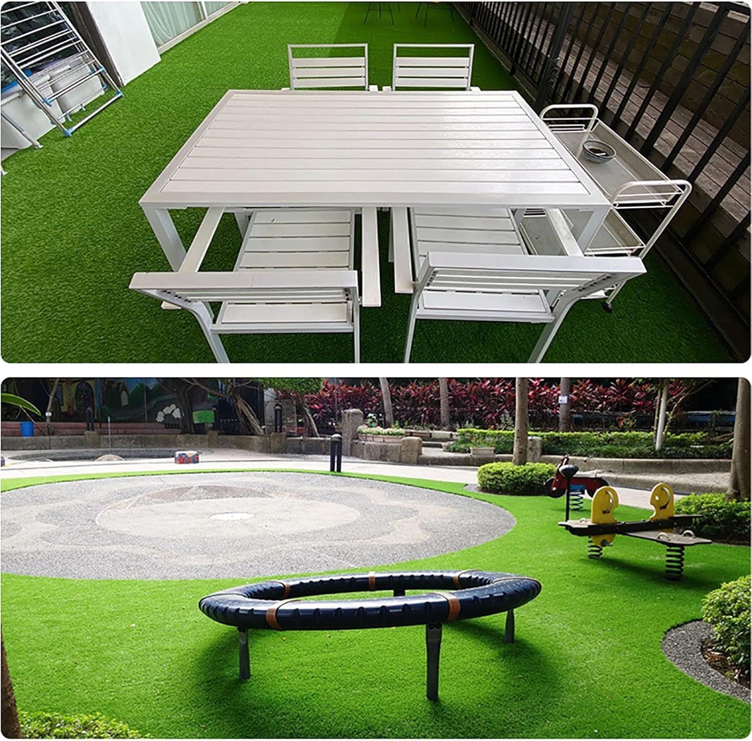★ High-quality Material – Made of high-quality polyethylene and polypropylene yarns, it is fire-resistant, corrosion-resistant, abrasion-resistant, aging-resistant, and UV-resistant. Rubber backed with drainage hole, easy to clean and can be dry quickly. Support friendly turf grass to pets and children running and playing.