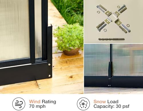 Strengthened Windproof Firmware: 4 corner posts & 2 middle posts, equipped with reinforced expansion screws, help bury the winter greenhouse kit deep in soil or concrete for extra stability. Wind Rating: 70 mph; Snow Load Capacity:30 psf