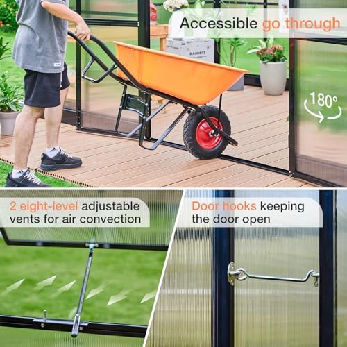 Walk-in Greenhouse for Better Ventilation: 2 wide swing doors (with door hooks) for easy entry to dozers and people. 2 eight-level adjustable side vents for air convection to manage excess moisture of the backyard greenhouse