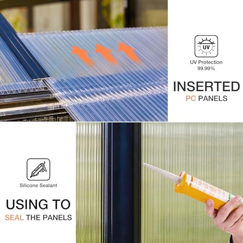 Solid Material: Heavy duty greenhouse has 6mm Twin-wall translucent PC panels(UV Protection 99.99%) and a rust-resistant aluminum frame (1.5mm),4 upgraded, thickened, and wider uprights, making the entire garden greenhouse more stable