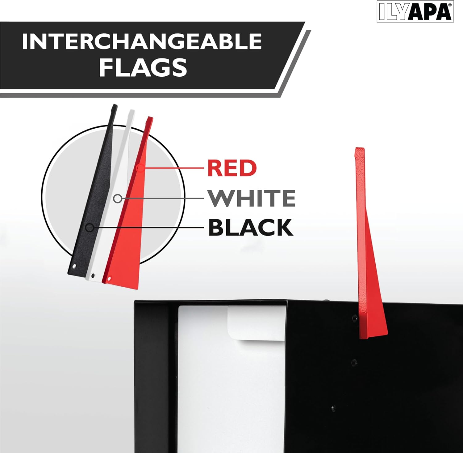 INTERCHANGEABLE FLAGS allow you to customize these contemporary mailboxes! Red, black, and silver extra flags are included, as well as required washers and nuts. An installation sticker explains how to quickly and easily swap out the flags, used for indicating outgoing mail.