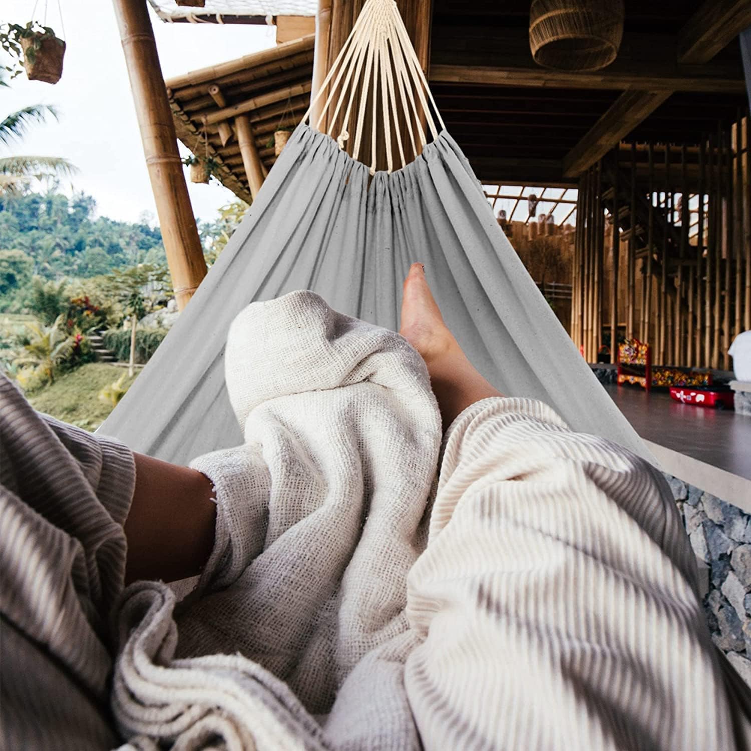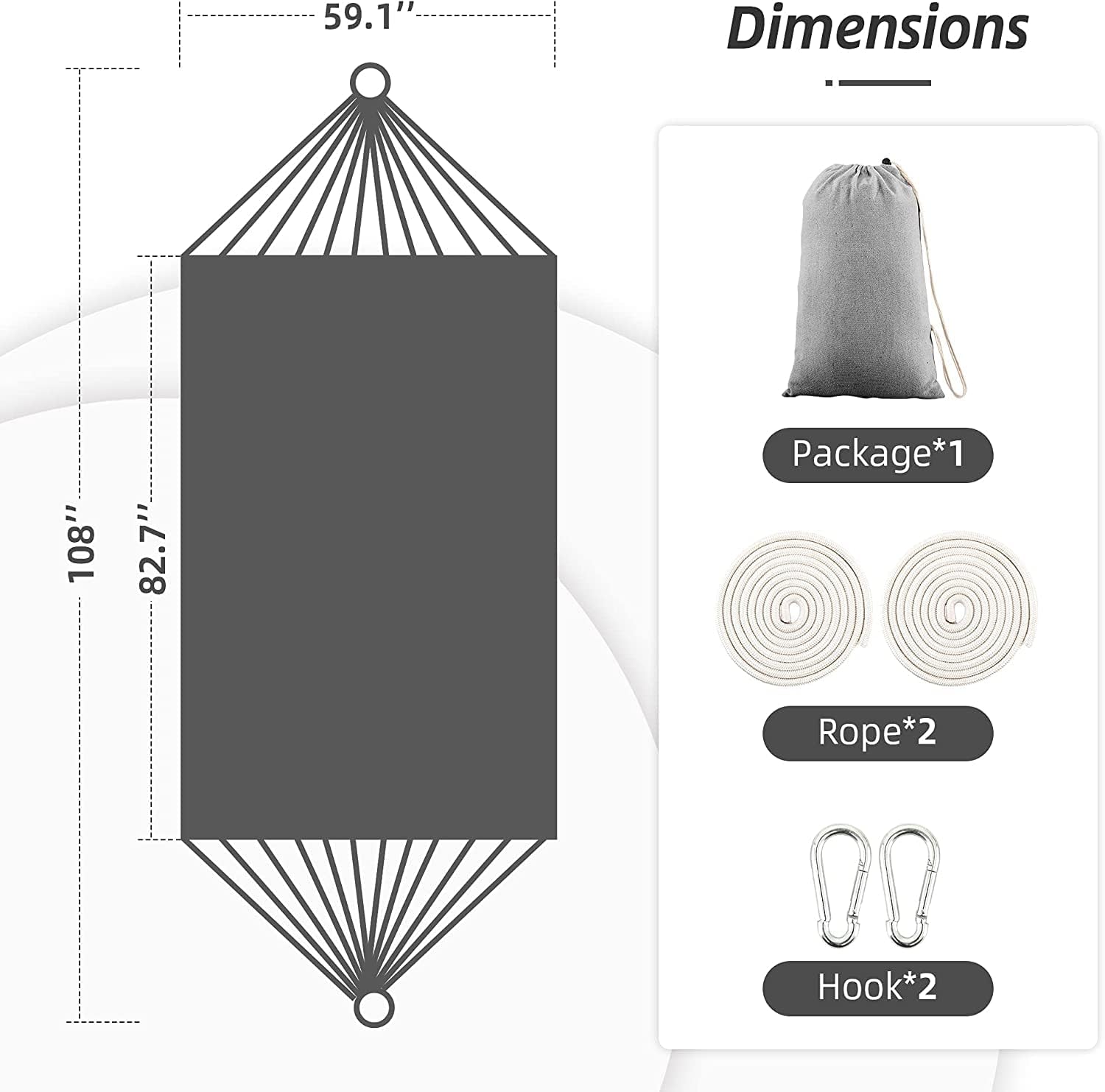 【Extra Larger】NORIDA Extra Larger hammock Constructed of tightly woven colorfast cotton, 2 Person Double Hammock,The bed of hammock is 83“ x 60”,Compared to our last generation hammock,this one is more longer and wider.the total length is 118inch/300cm(unstretched) from loop to loop,Hang outdoors between two trees in your favorite shady lawn spot, porch, patio, backyard, beach